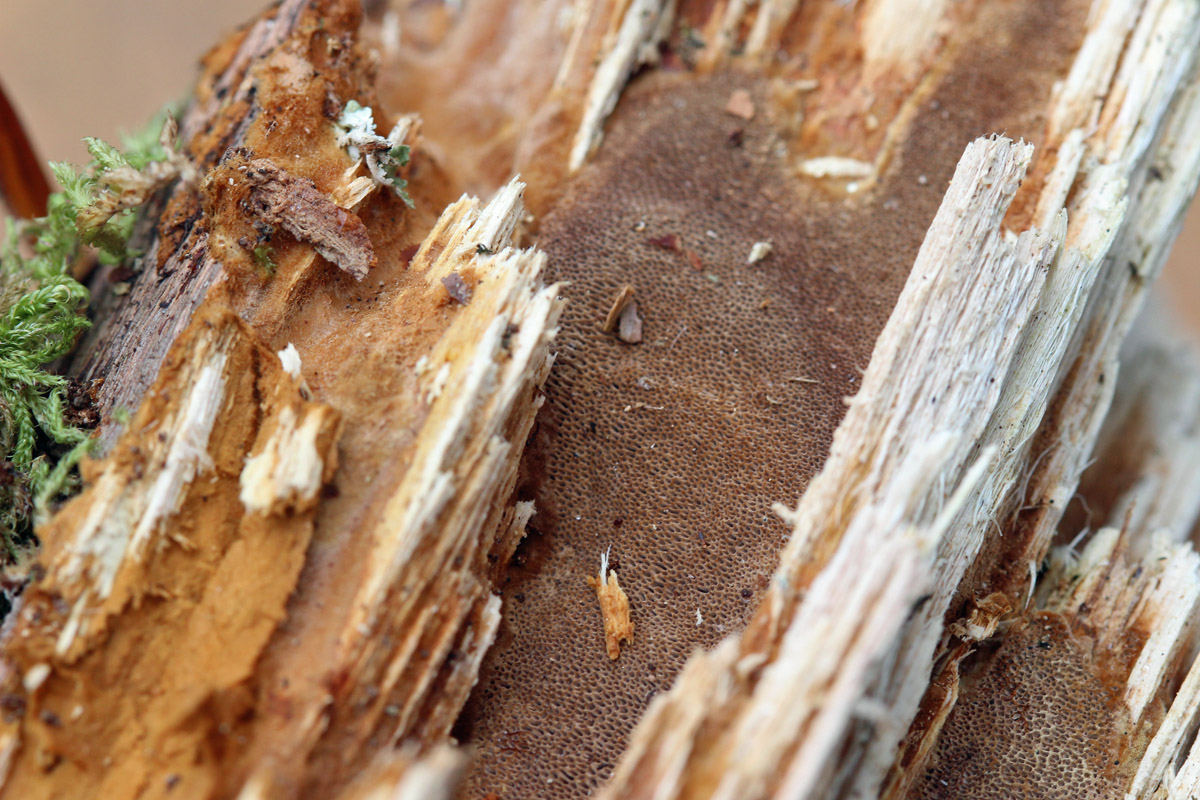 Der Pilz bildet dünne, flache Fruchtkörper. Anfangs war ich mir nicht sicher, ob es sich nicht um eine Flechte handelte. Die abgebildete Stelle mit dem Pilz misst etwa 3 x 1,5 cm.