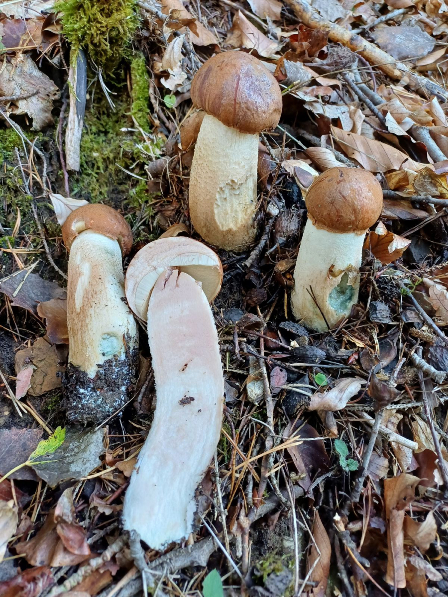 Gefunden am Rand eines Kiefern-Buchen-Waldes, aber in unmittelbarer Nähe standen auch eine Espe und eine Eiche, jedoch keine Birke. FeSO4 im Fleisch blaugrün. Im Mikroskop habe ich (noch) nichts angeschaut, weil ich im Schlüssel nichts von Relevanz gefunden habe.