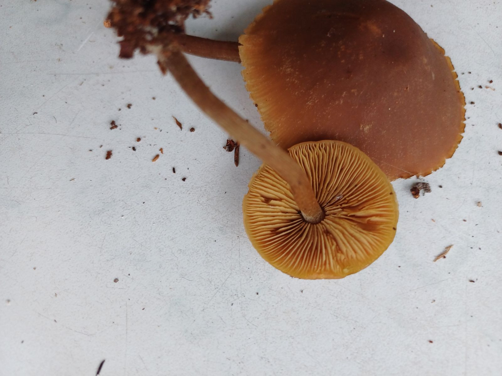 Von oben dachte ich bei dem größeren (Hutdurchmesser 6 cm), es sei bestimmt ein Dachpilz, und der kleinere was anderes.