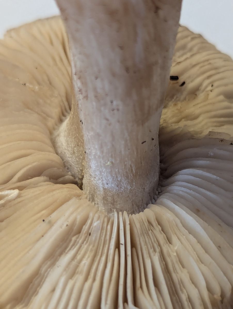 Auf dem Hut sind dunkele Schüppchen. An einer Stelle am Stiel ist eine leichte Rötung. Das Fleisch ist weiß.