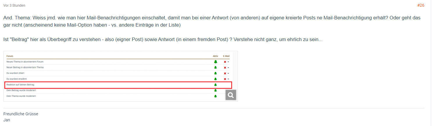 And. Thema: Weiss jmd. wie man hier Mail-Benachrichtigungen einschaltet, damit man bei einer Antwort (von anderen) auf eigene kreierte Posts ne Mail-Benachrichtigung erhält? Oder geht das gar nicht (anscheinend keine Mail-Option haben - vs. andere Einträge in der Liste)