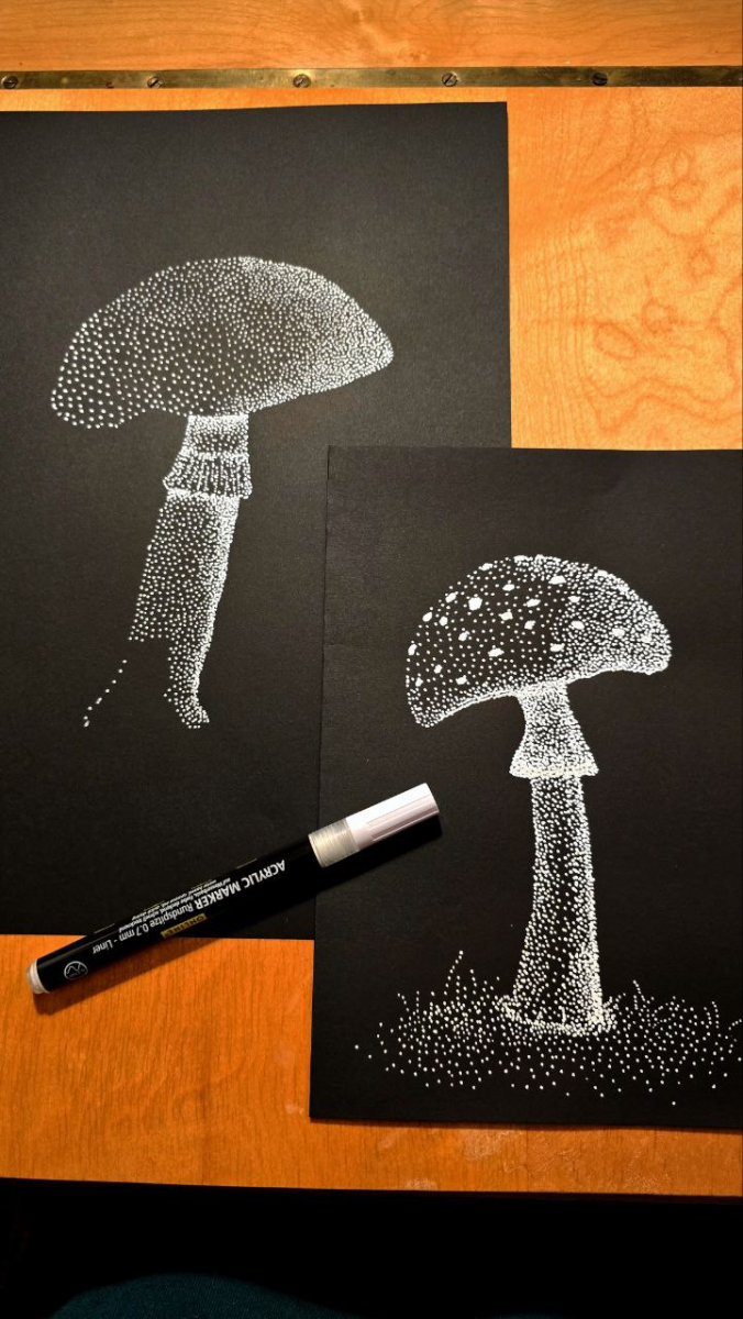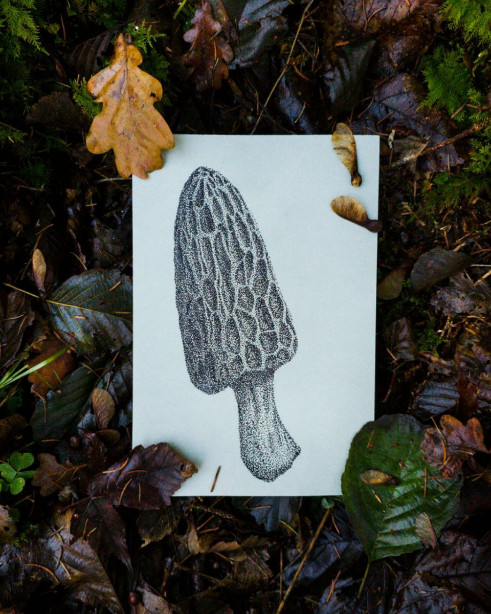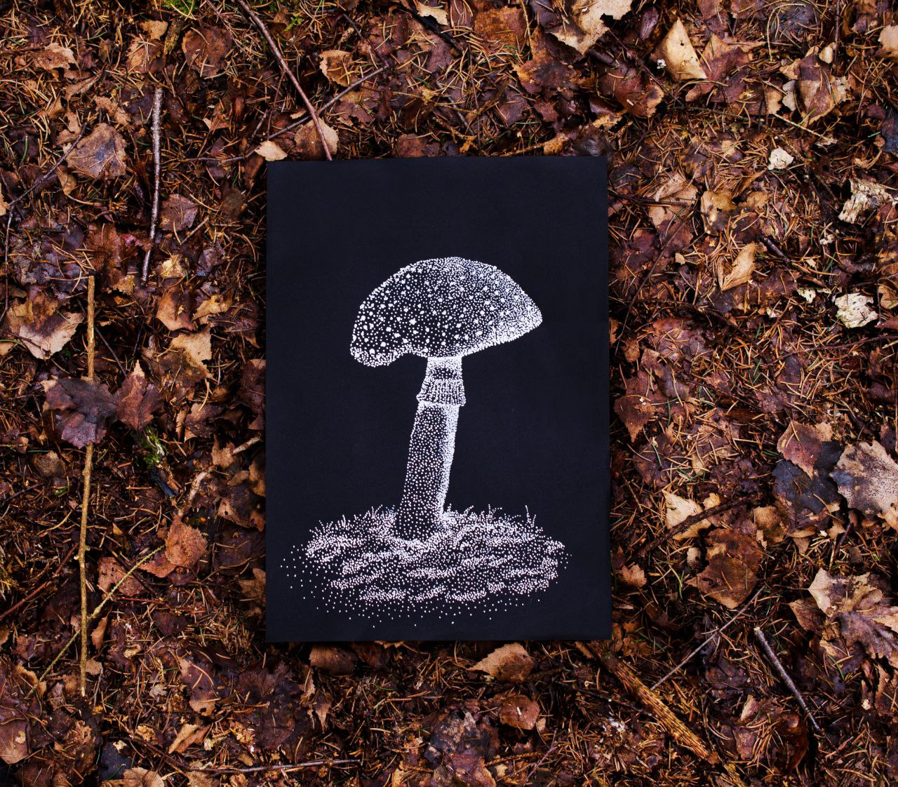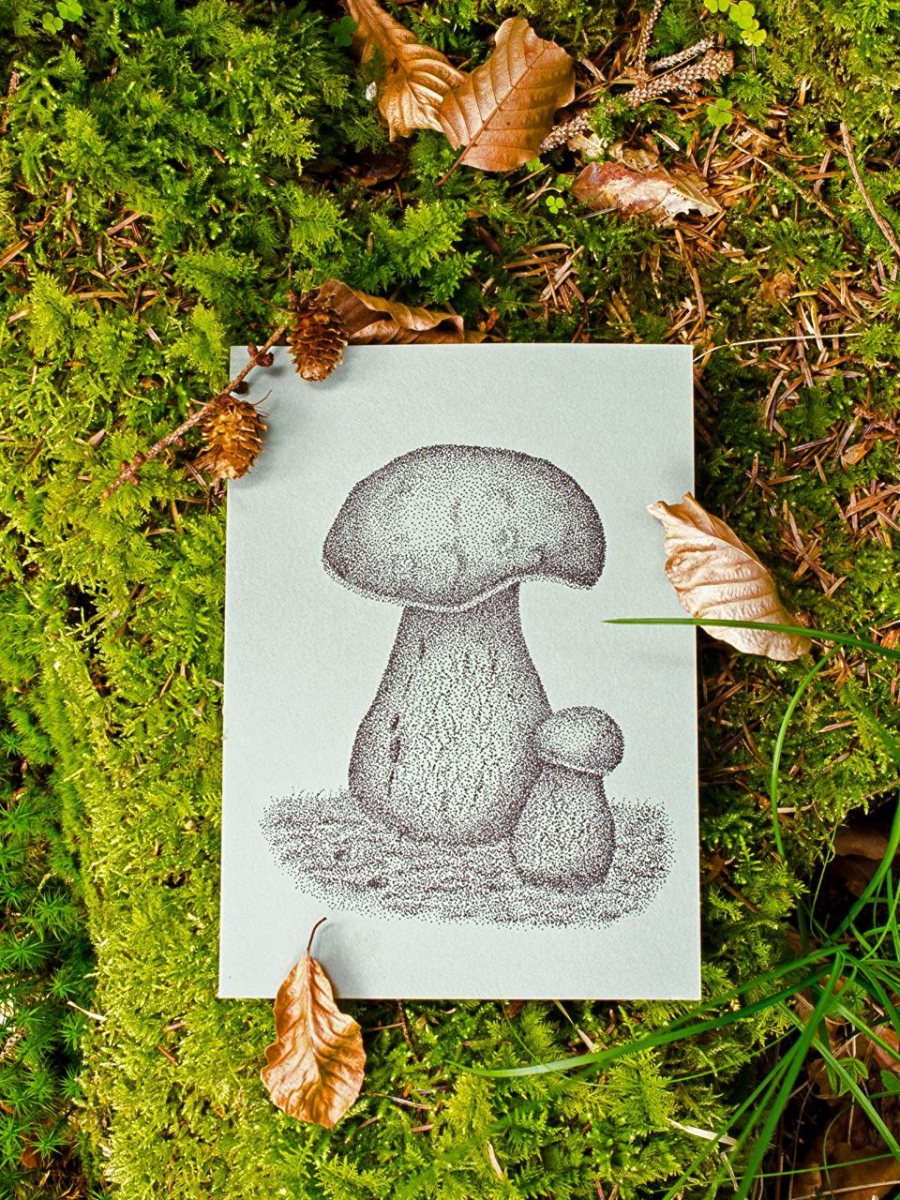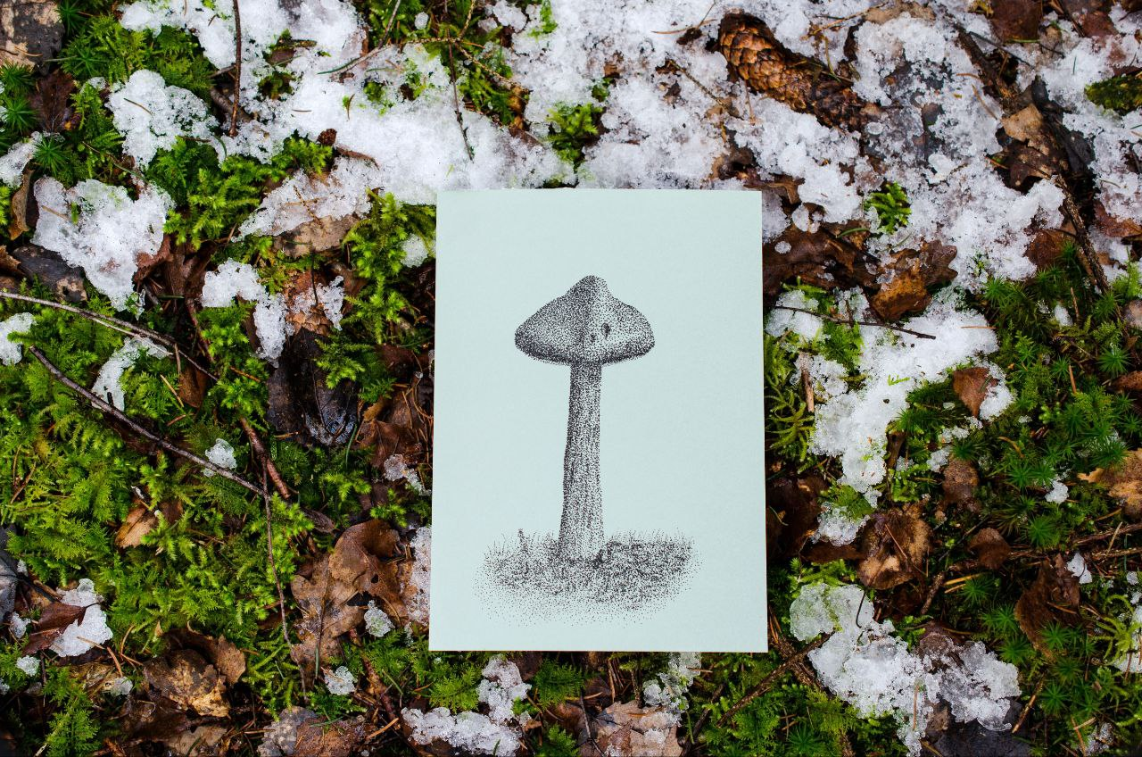 Ich zeichne davor mit Bleistift die Konturen und zudem einen Pfeil, woher das Licht kommt (damit ich das nicht vergesse und die Schattierungen stimmig wirken...). Dann wird in vielen Sessions mit einem Micron-Fineliner „punktiert“. Ich mag sehr, wie entschleunigend es ist, so zu zeichnen. Und ich finde es faszinierend, wie sich aus kleinen Einheiten etwas Großes zusammensetzt. Bei den Punkten denke ich auch immer an die Sporen von Pilzen ![]()