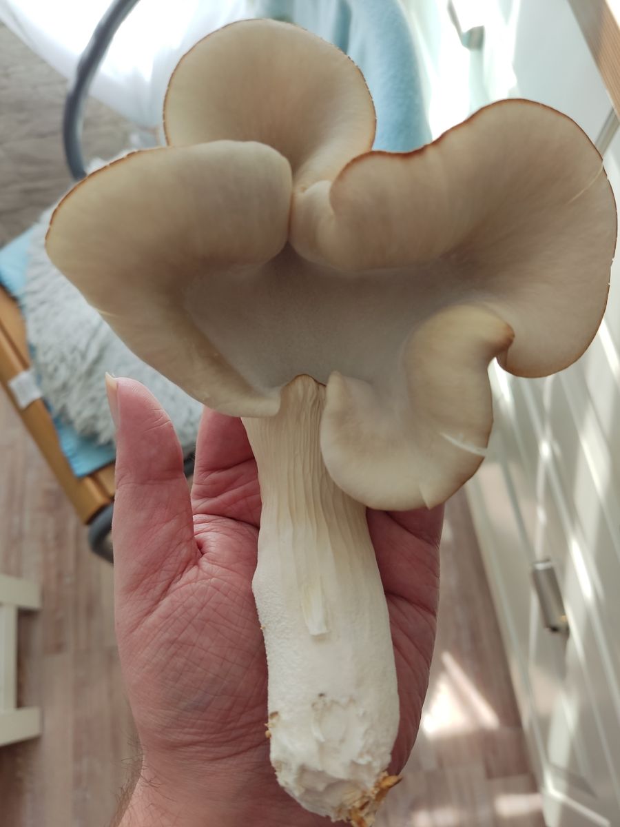 Die ersten Austernpilze (in der Wohnung) hatten einen ziemlich starken Stiel und sind quasi Trichterförmig bis blumenähnlich gewachsen und waren ziemlich blaß. (Siehe erstes Bild).