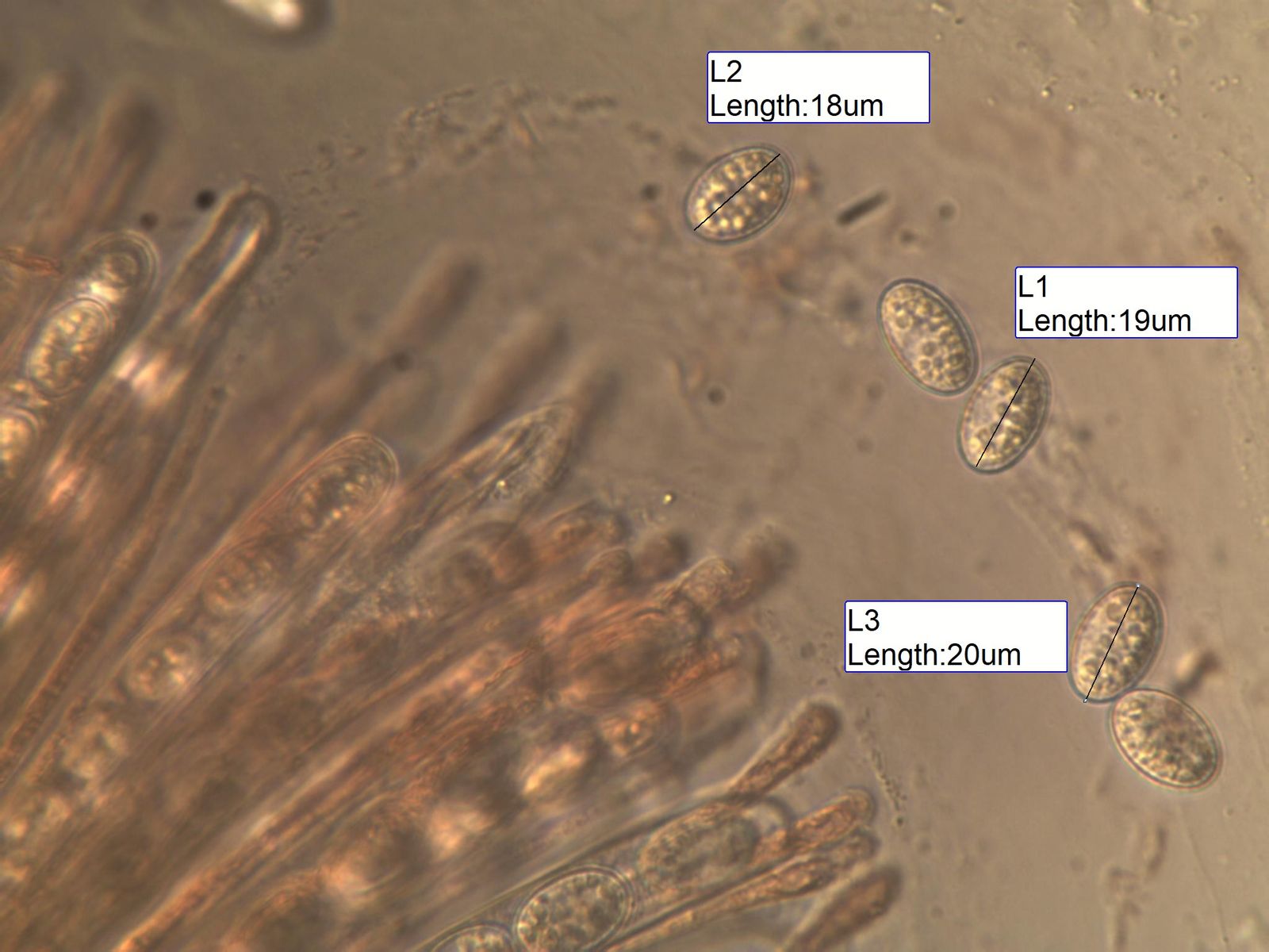 Sporengrößen, Sporen mit Struktur, aber in den Schärfeebenen keine Warzen sichtbar.