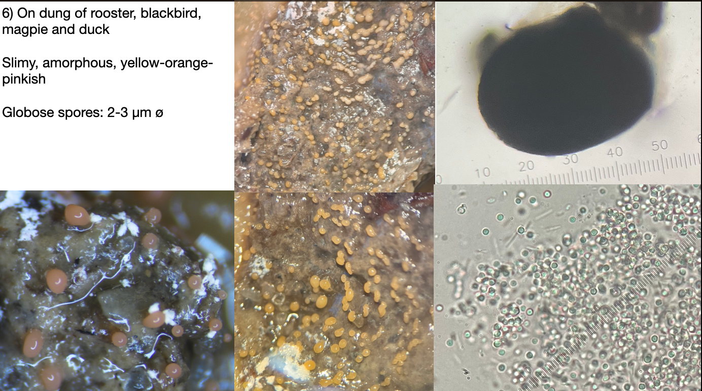 Für meine Masterarbeit beschäftige ich mich mit koprophilen Pilzen auf Schildkrötenkot und verschiedenen Vogelarten. Die meisten Pilze habe ich bereits identifiziert, aber bei manchen fällt mir die Bestimmung auf Gattungsebene, geschweige denn auf Artebene, immer noch schwer. Ich hoffe, Sie können mir bei der Bestimmung dieser Arten helfen. Anbei finden Sie Bilder und Maße aller 6 Arten.