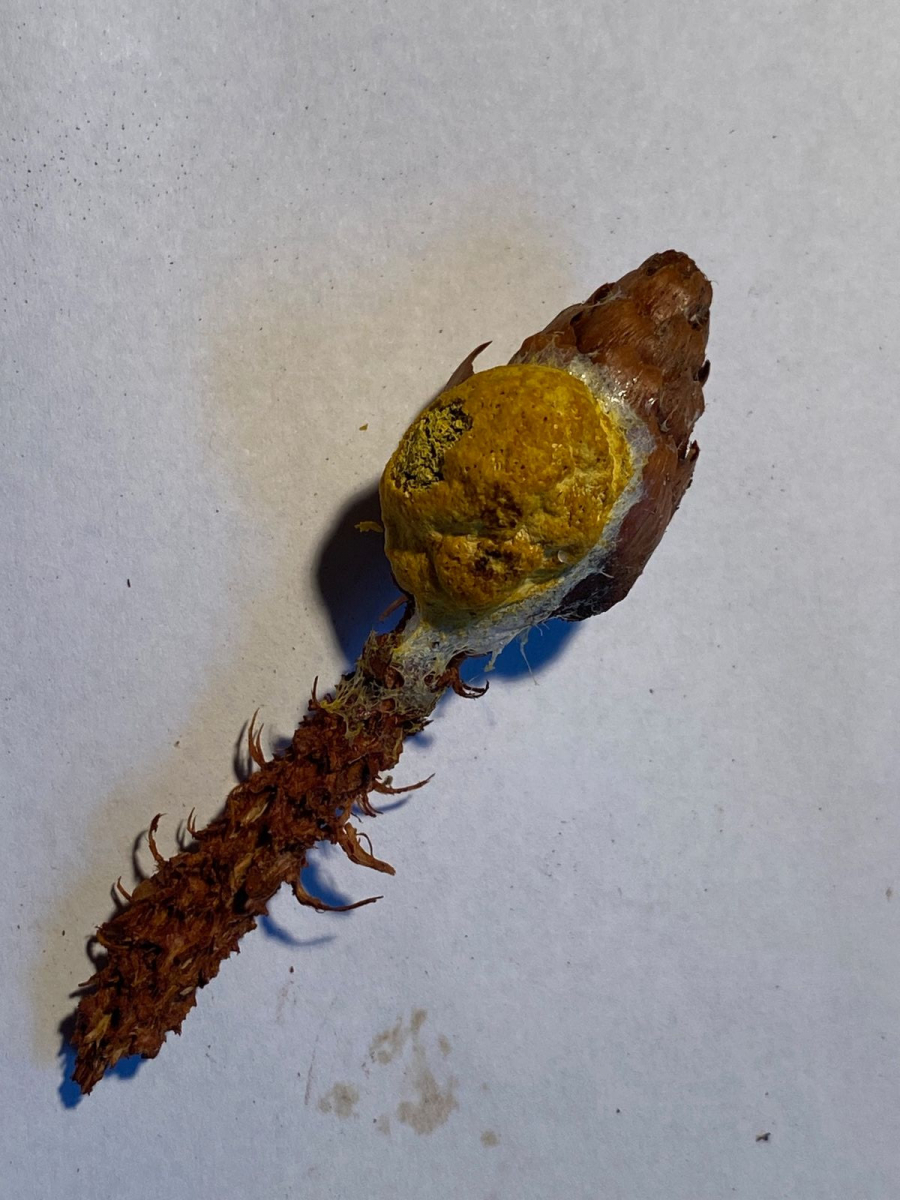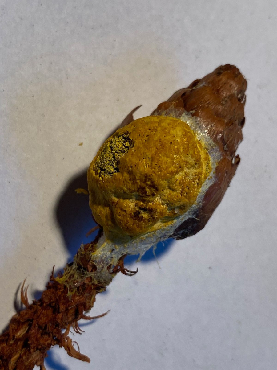 Gelber Pilz auf Totholz (Tannenzapfen) SGG 18. Juni 2025 Ist ziemlich vertrocknet, deshalb nicht wirklich streichfähig...Danke!
