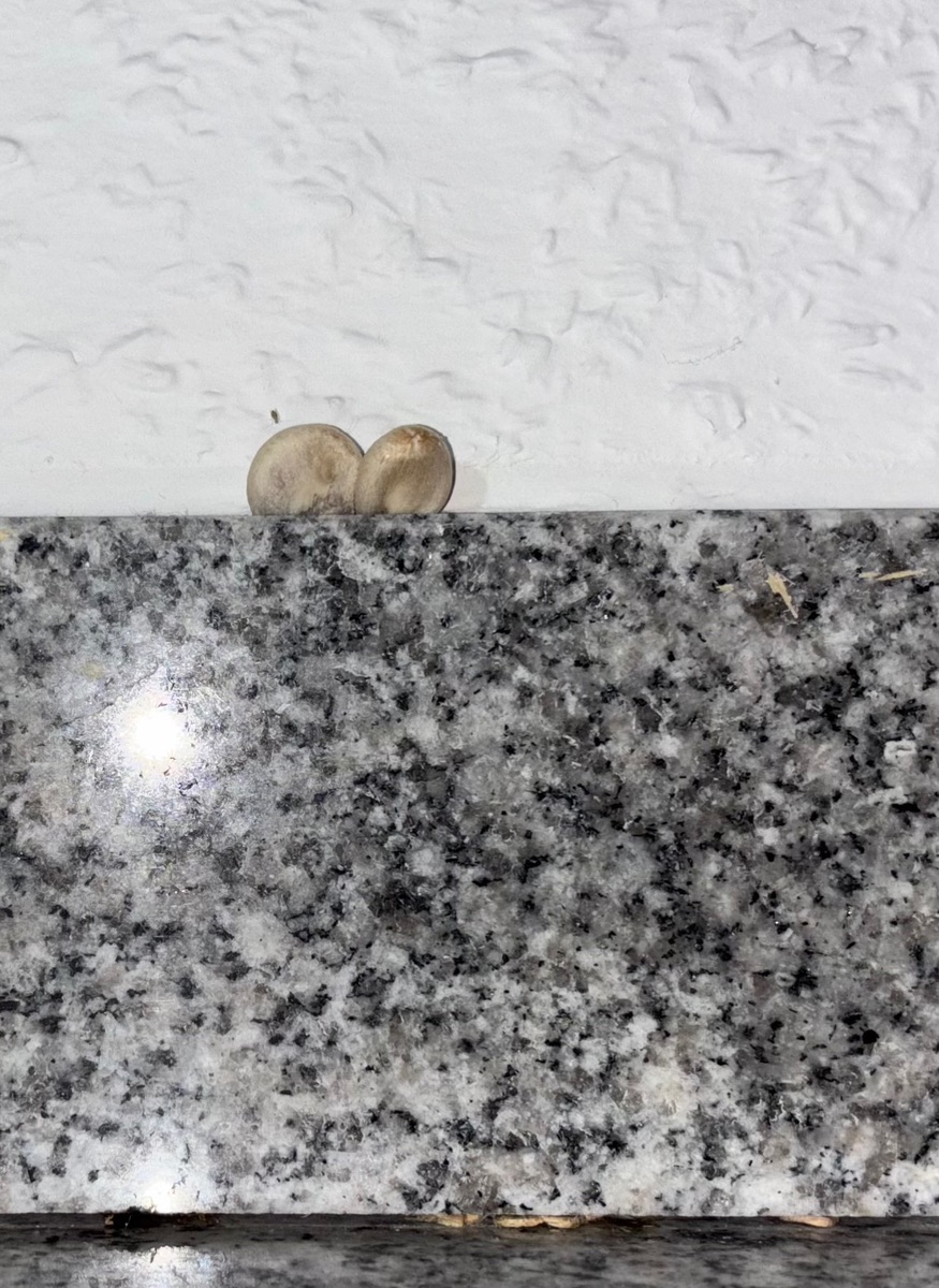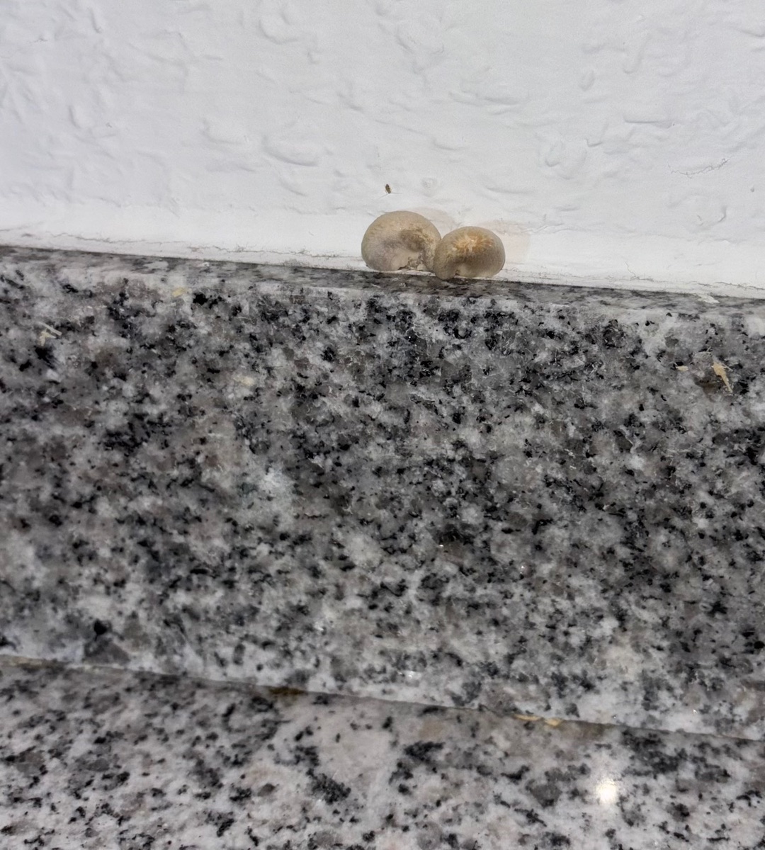 • Der Pilz wächst direkt aus der Wand, knapp oberhalb einer Granit-Sockelleiste.