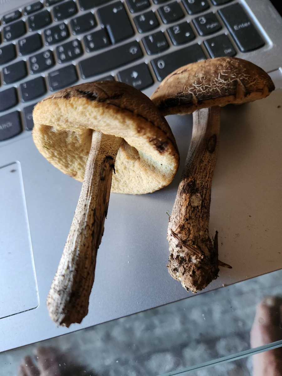 ich bin neu hier und wollte fragen ob mir jemand weiterhelfen kann. Ich bin jetzt schon ein paar mal in den letzten Tagen über diesen Pilz "gestolpert". Und weiss nicht was das ist. Soweit ich mich nicht täusche wächst er auf Totholz, aber es waren keine grossen Baumstümpfe. Es ist ein Röhrling dem Anschein nach, er bläut nicht beim Anschneiden, der Hut ist ledrig, okker und der Stiel mit einem schwarzen Netz welches auffällig ist.