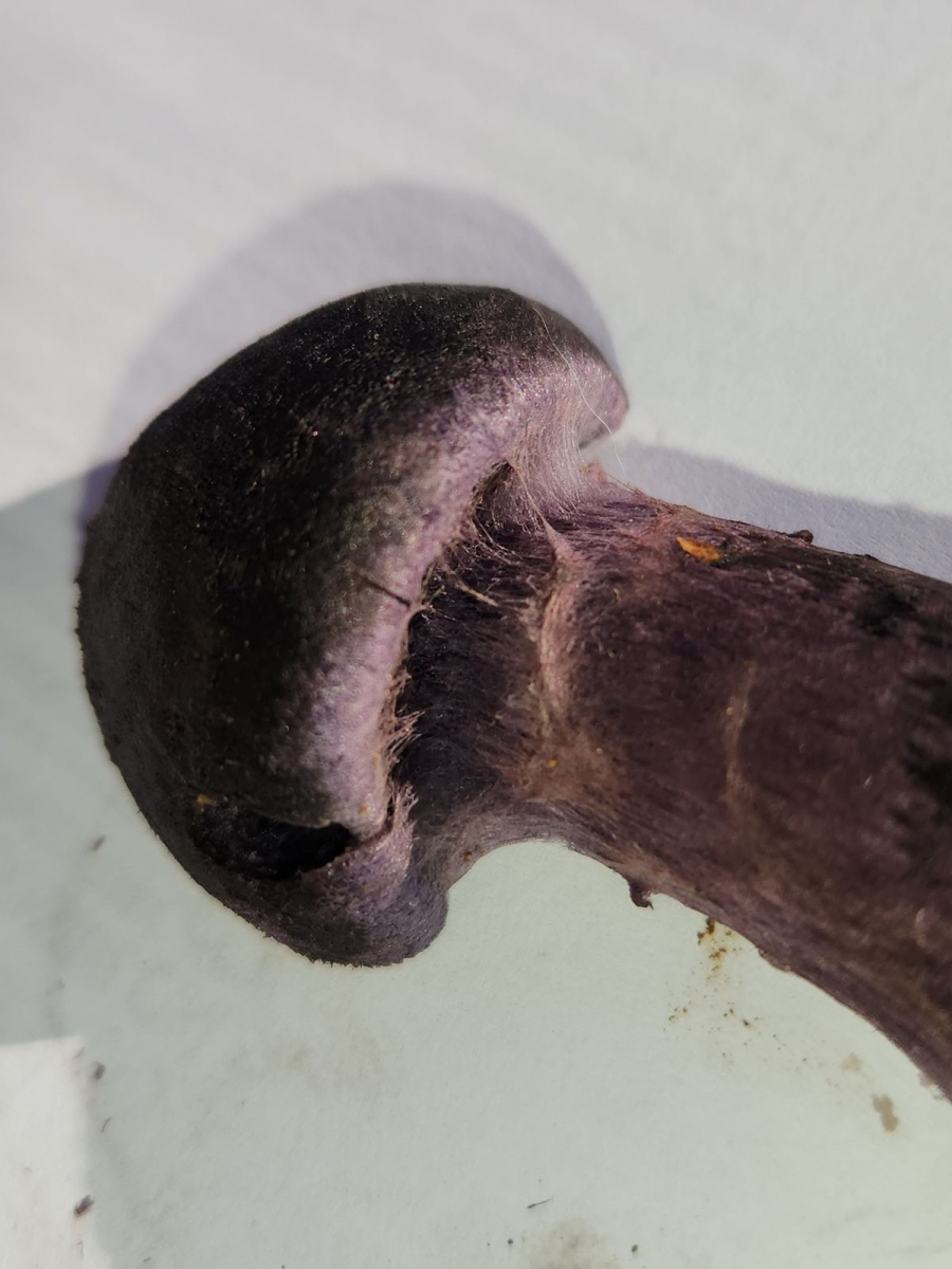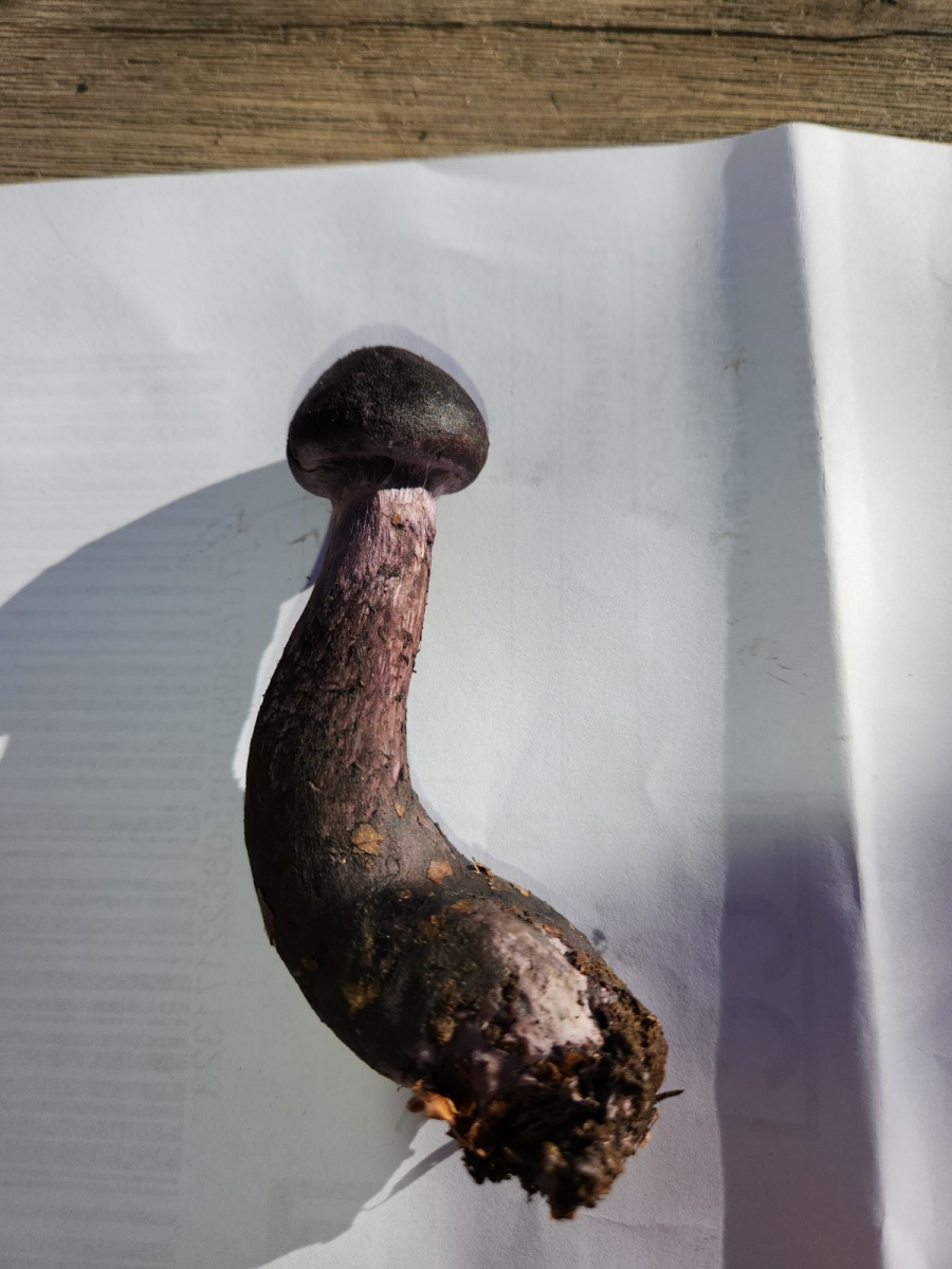 ich habe diesen Pilz am Boden gefunden. Er ist ca. 13cm lang, der Hut ca. 2cm im Durchmesser. Vom Hutrandd zum Stiel sind fasern zu sehen. Er ist sehr lila, hat dann beim Transport nach Hause etwas an Farbe eingebüsst. Ein einzelnes Exemplar kein weiteres weit und Breit, Laubwald.