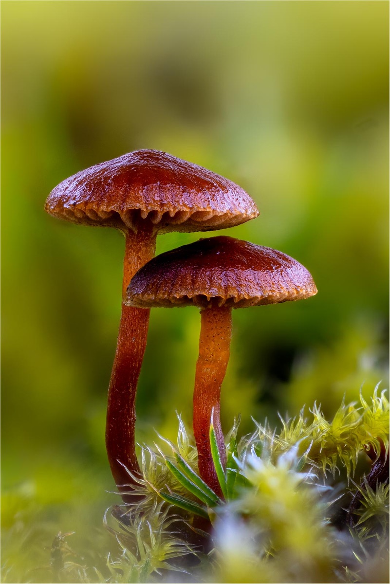 für mich ist das Foto der Prachtbecher von Bea ein Beispiel für hervorragende Pilzfotografie. Es handelt sich um einen technisch perfekten Stack, der ab dem Mittelgrund eine bewusst "nach hinten" verlaufende Unschärfe setzt, um Tiefenwirkung zu erzeugen. Das gilt auch für den zweiten Fruchtkörper im Hintergrund - ich bin sicher, dass die Fotografin diesen deshalb absichtlich leicht in der Unschärfe belassen hat. Der Vordergrund ist weitgehend in die Schärfeebene integriert, das Moos in der rechten und linken Ecke des Vordergrunds ist vielleicht minimal unscharf, was m.E. aber nicht ins Gewicht fällt. Die Bildkomposition ist vorbildlich: Der zentrale Fruchtkörper sitzt als dominantes Motiv auf den Eckpunkten der Linien des Goldenen Schnitts, sein Gewicht wird durch den zweiten Fruchtkörper und die sehr schönen Moosblättchen rechts neben dem Becher austariert und ins Gleichgewicht gebracht. Die Abschattung der Pilze bzw. die Lichtdiffusion bei der Aufnahme vermeidet jede Überstrahlung und lässt die Eigenfarben der Prachtbecher satt hervortreten. Umgebungsmoos und Hintergrund lassen das natürliche Habitat der Pilze deutlich werden, ohne vom Motiv abzulenken, Gleiches gilt für die dezenten Grüntöne, von denen sich das Gelborange abhebt.