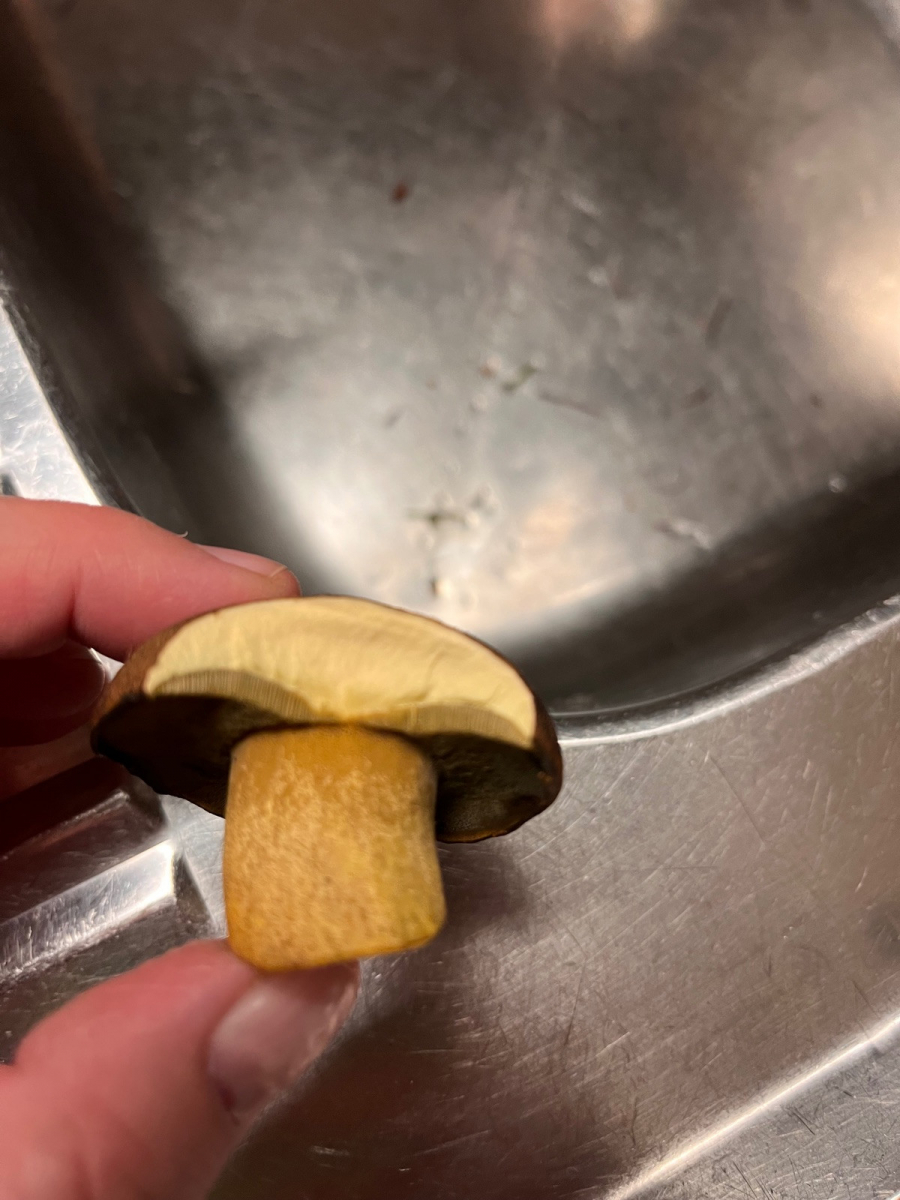 Röhrling mir dunklen Röhren und hellem Stiel Pilzjudith 21. September 2025 Er blaut bei Anschnitt nicht, hat eine feste Konsistenz. In meinen Büchern finde ich keine passende Übereinstimmung für diesen Pilz mit dunkel-oliv-farbenen Röhren.