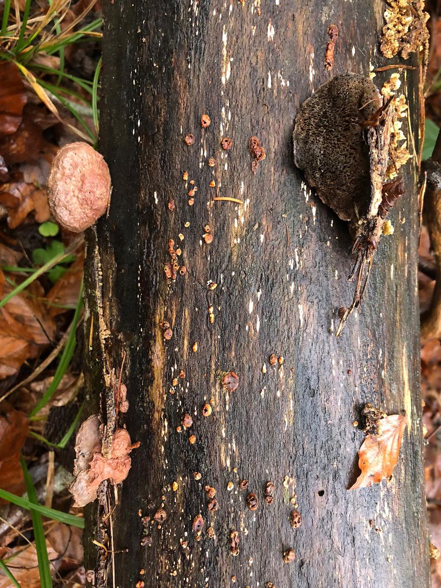 Buchentotholz, leider auf dem Bild nicht erkennbar aber die Unterseite ist cremeweiß und hat sehr feine unregelmäßig aber größtenteils rundliche Poren. Pilziger Geruch, vielleicht leicht süßlich.