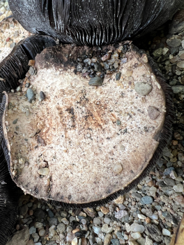 • Hut: Durchmesser ca 6cm, dünne, papierartige, leicht reißende helle/grau-beige Haut, Außenkante schalenartig nach oben wölbend (es liegen noch einige Sandkörner darauf, die sich nicht abpusten ließen)
