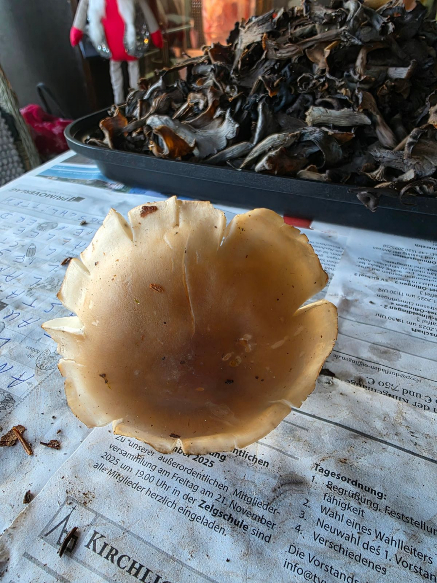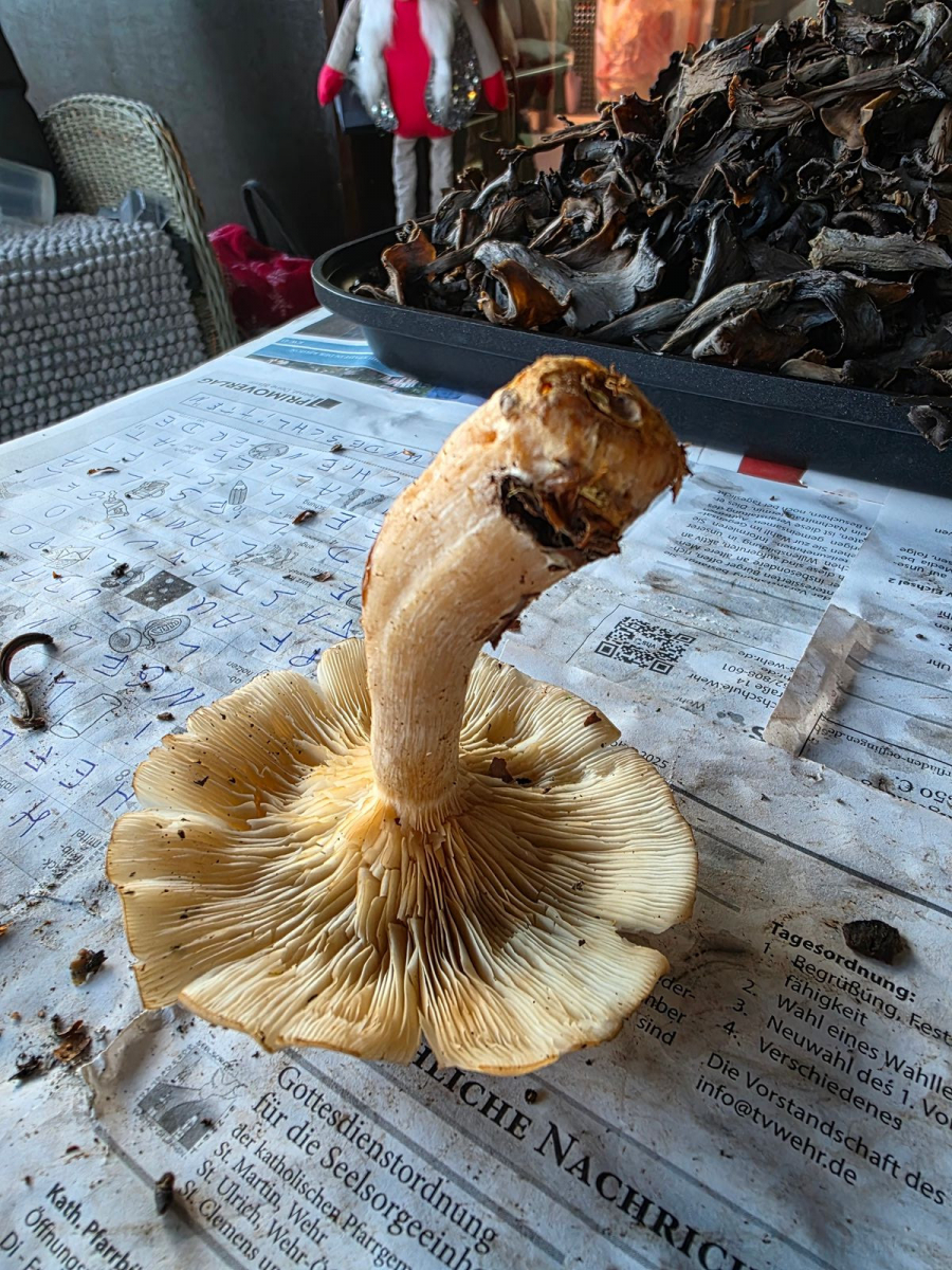 Hallo Pilzfreunde, habe heute beim Totentrompeten sammeln hunderte dieser recht grossen Pilze gesehen, oft auch im Hexenring. Brauner Hut, nach aussen hin heller werdend. Hut trocken, glatt. Lamellen und Stil weiss. Keine Verfärbung oder Milchaustritt.