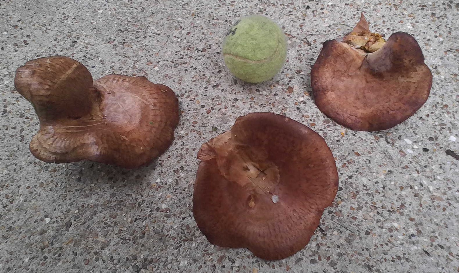 und jetzt einige dieser braunen Pilze in der Wiese neben einer Birke - was könnte das sein? (Tennisball zum Größenvergleich, entschuldigt die schlechte Fotoqualität, ist nur mit der Laptopkamera aufggenommen)