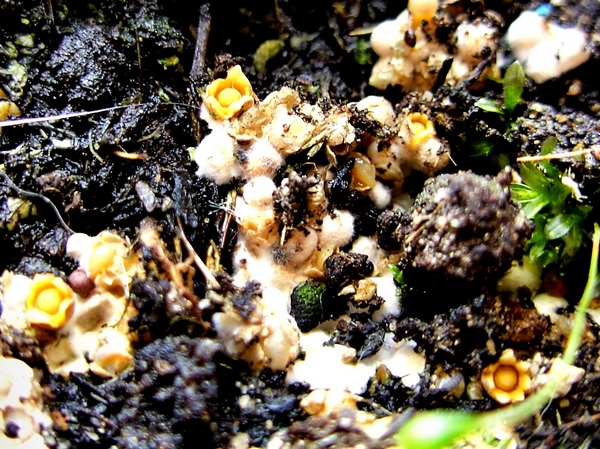 Ich hatte ja schon an Schleimpilz gedacht, doch das war ´s auch nicht, denn da hat sich gleich so eine feste weißliche Schicht auf der Erde gebildet aus der dann die Fruchtkörper kamen.