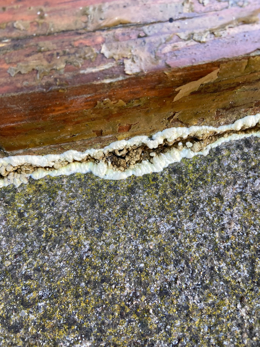 Welchen Pilz habe ich mir da eingefangen? Es ist die Abschlusskante Holzhaus zu Bodenbeton an der Wetterseite.