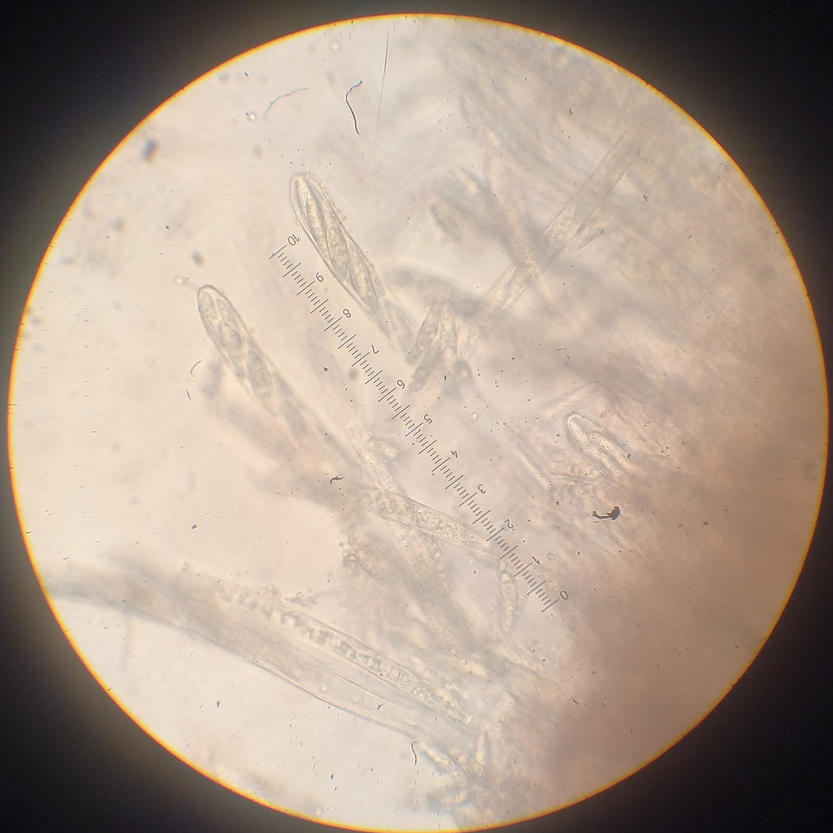 Mitte Dezember kleine rein weisse Pilzchen mit Stiel (bis ca. 2 mm Länge) und rundlichen Köpfchen (bis ca. 2 mm Durchmesser) an einem in ca, 2 m Höhe abgebrochenen Buchenstamm Durchmesser geschätzt 120 cm. Die zähen Köpfchen enthielten gebogene und teilweise verzweigte Hyphen. Anfang Februar waren die Pilzchen hellbeige und enthielten glatte braune nahezu runde Sporen (8 - 10 Mikrometer). Die Pilzchen riechen nun deutlich nach Maggi. Gefunden wurden sie im Kottenforst bei Bonn.