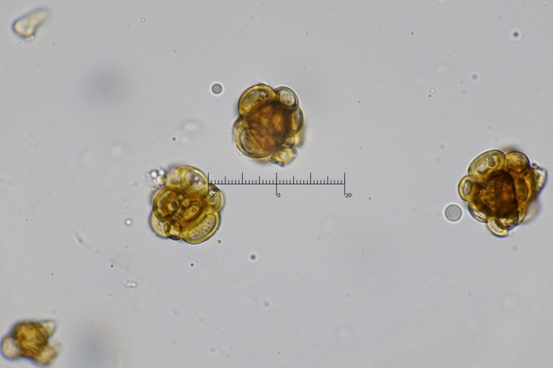 Ich denke daher, dass es sich vor allem aufgrund der Form mit den meist verjüngten Scheiteln bei diesem Fund um P. alnetorum handelt. Was mich nun doch wundert sind die zwei folgenden Funde, bei denen es sich meiner Ansicht nach auch um die selbe Art handeln dürfte. Der erste der beiden stammt vom 28.02.2026 aus einem Auwald am Bodensee bei Bregenz. Die Sporen sind bei diesem (35.3) 46.2-53.4-61.5 (69.4) x (15.2) 15.7-18.3-20.7 (23.3) groß mit einem Q-Wert von 2.2-3.6. Die meisten Sporen sind am Scheitel verjüngt, aber es gibt hier auch einige mit stumpfem Scheitel.
