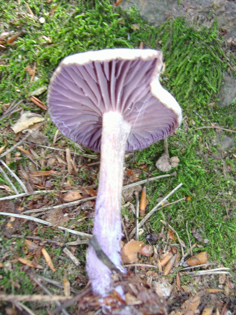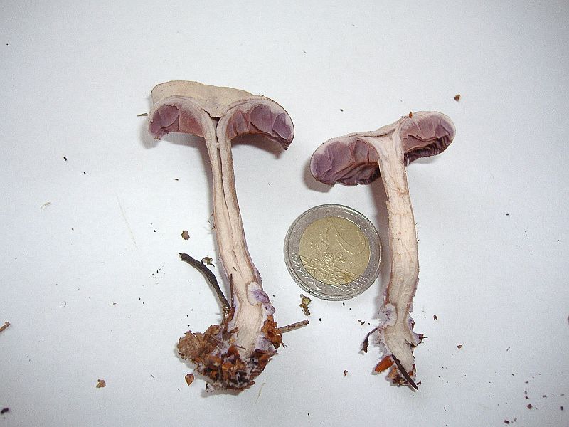 violetter, gerader fasriger Stiel, violett-bräunlicher Hut, violette Lamellen,