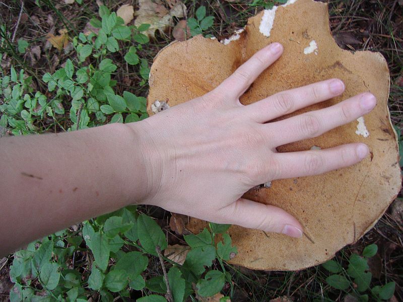 Ich hab ja noch nicht viele gesehen, aber dieses Birkenpilz Exemplar kam mir wahrlich groß vor, hab mal meine Hand als Vergleich mit abgelichtet.