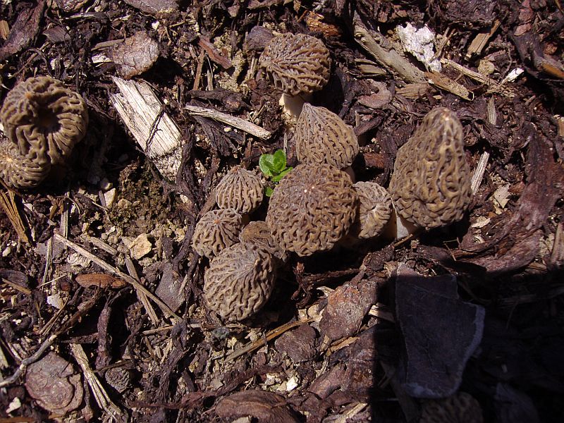 Der tägliche prüfende Blick auf ein ausgedehnte Rindenmulchareal hat sich endlich gehlohnt, mit großer Freude habe ich heute die gut getarnten Morchelnester erspäht