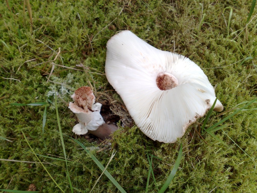 ich hätte jetzt mit meinem wenigen Wissen diese als Perlpilze beinahe ausgeschlossen, weil sie keinerlei Manschetten aufweisen! Tatsächlich war diese aber wohl noch als "Haut" über den Lamellen drüber, ist ebenfalls geriffelt, der Hutring ist glatt. Im Gegensatz zu den 1-3-Bildern ist der Stamm allerdings deutlich dicker, die Pilze sind ja wohl auch noch kleiner. Sie sind eher weiß-grau in der Farbe. Riechen eher wenig, eine Leckprobe am Schnitt scheint mir eher neutral...