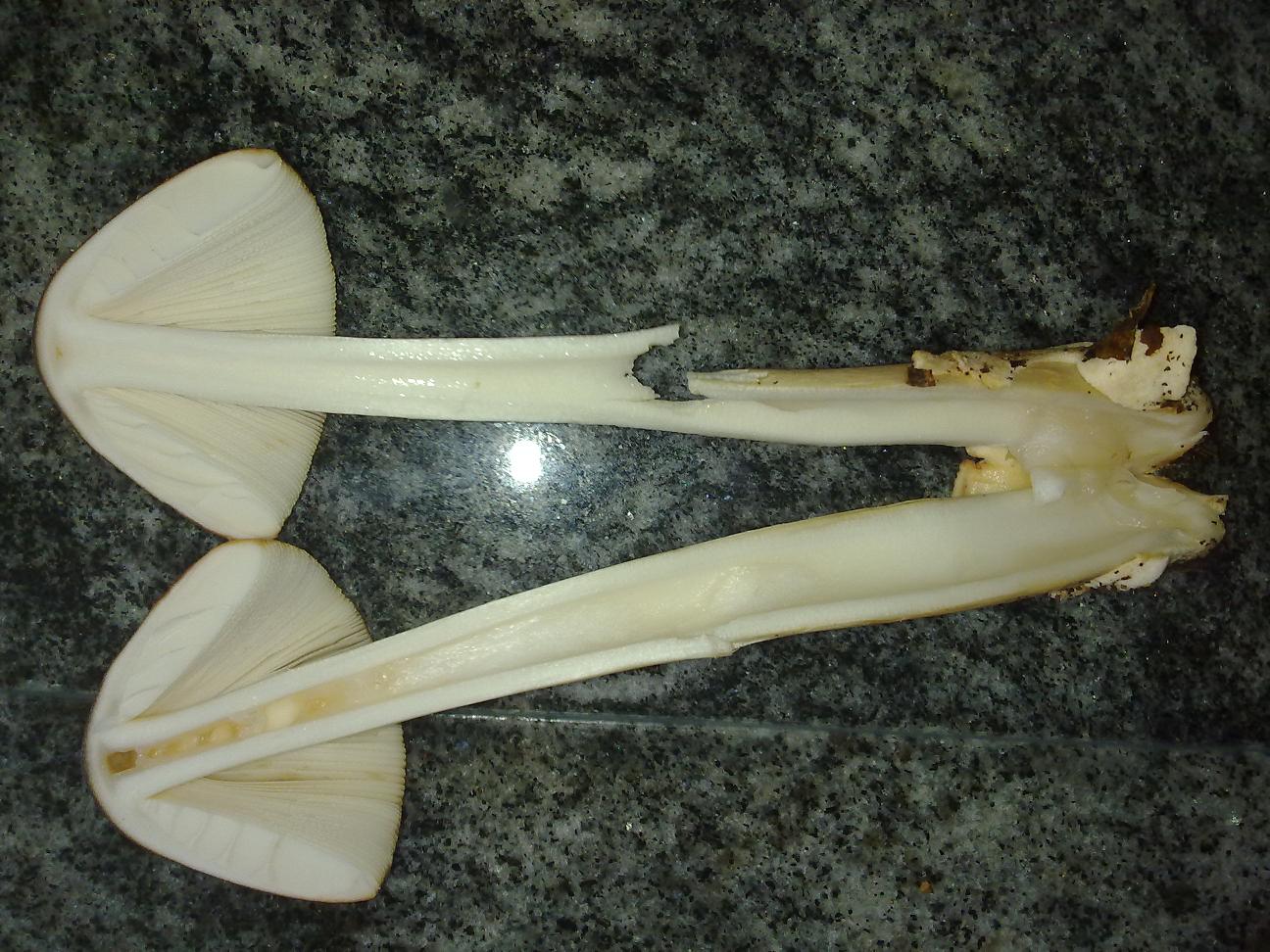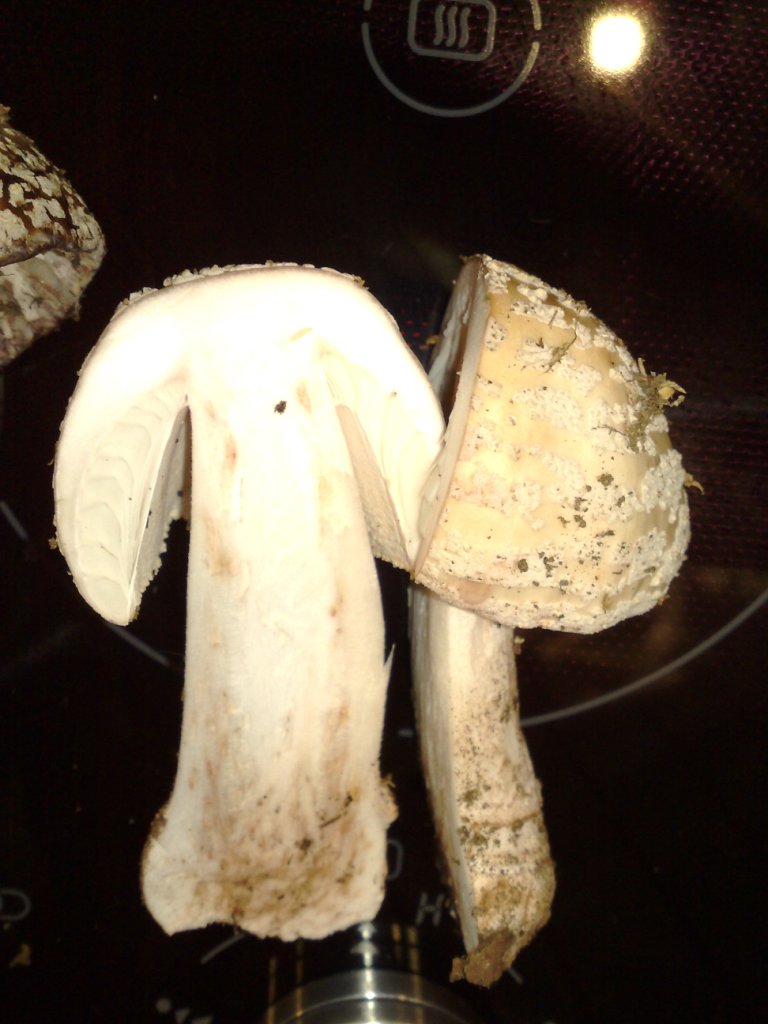 Beim Aufschnitt fiel mir auf, dass im Wurzelbereich und im Hut das Innere schleimig schien, verschwand aber schnell. Hutdurchmesser ca. 5 cm, Stammhöhe etwa 15 cm. Innen klar eine Röhre zu erkennen.