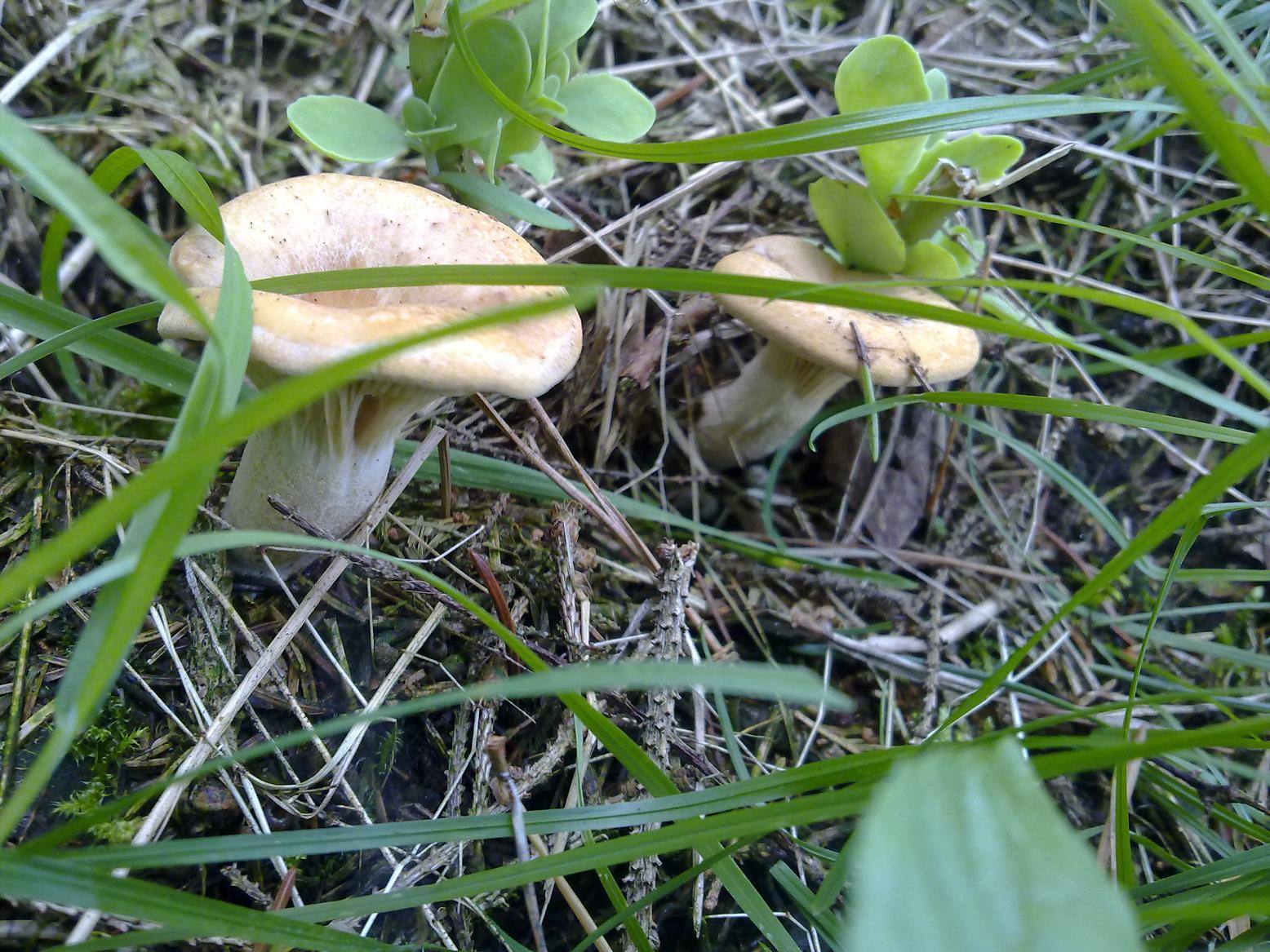 Größe und Form erinnern entfernt an Pfifferlinge (ich meine auch Leisten zu erkennen), sie wachsen am Rand eines Fichtenwaldes.