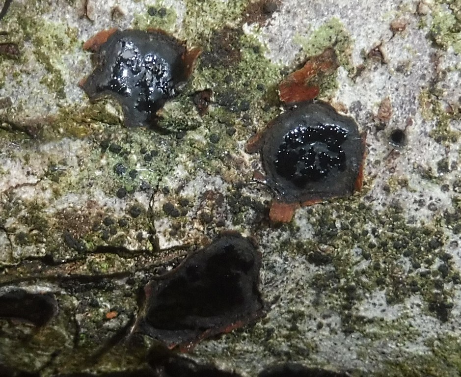 Ich denke, dass es sich um D. vernicosa handeln dürfte; wegen der deutlichen und langen Stiele und weil die Fruchtkörper zu zerfallen scheinen. Sie müssten dann auf verbranntem Holz vorkommen. Kann das sein? Frische Fruchtkörper müssten innen gelatinös sein.
