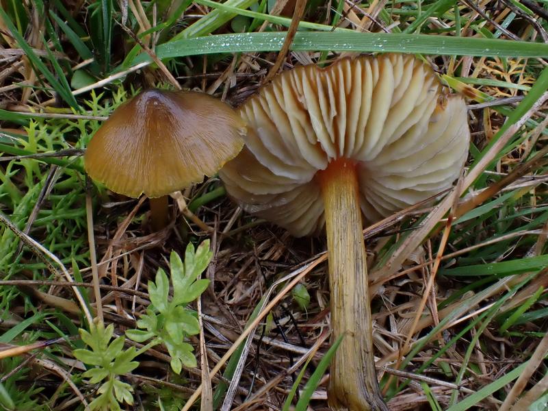 Nahe Haparanda fand ich heute morgen auf einer Wiese diese Saftlinge, bei feuchtem Wetter mit eventuell ganz leicht klebrigem, ausgebreitet bis 35 mm breitem Hut.