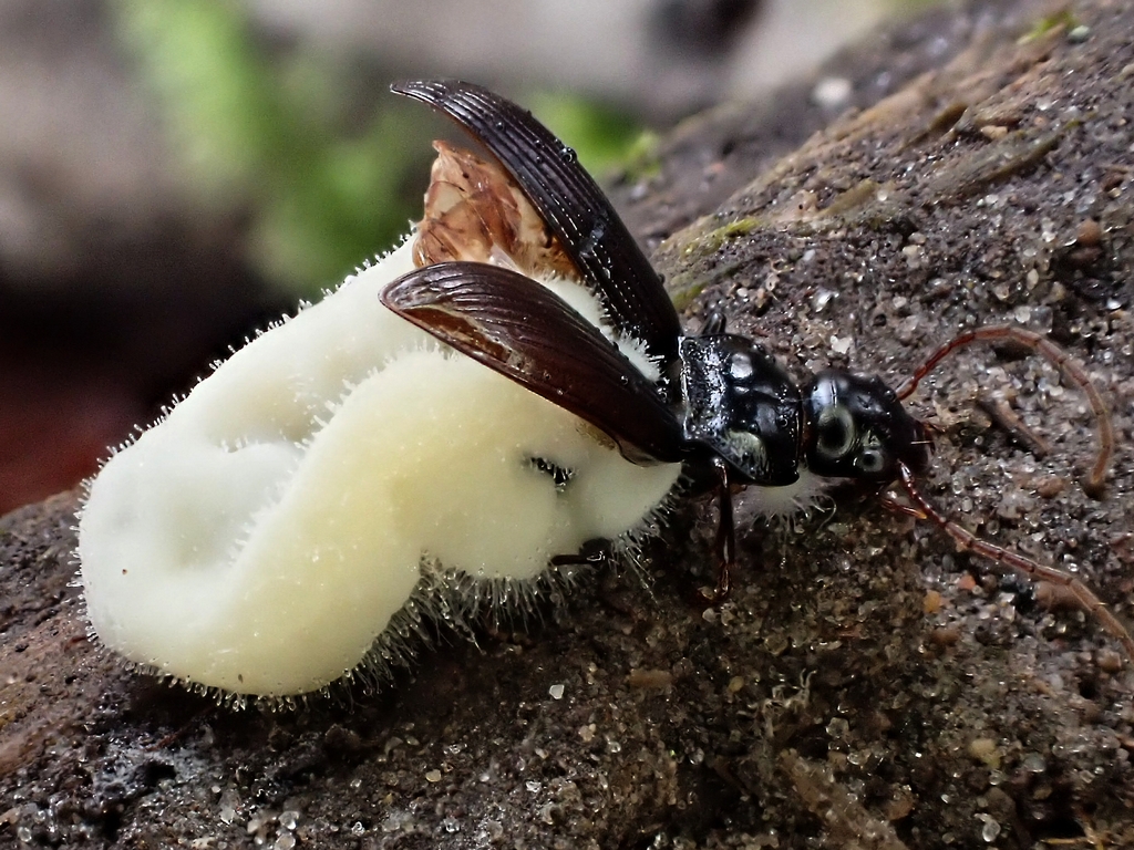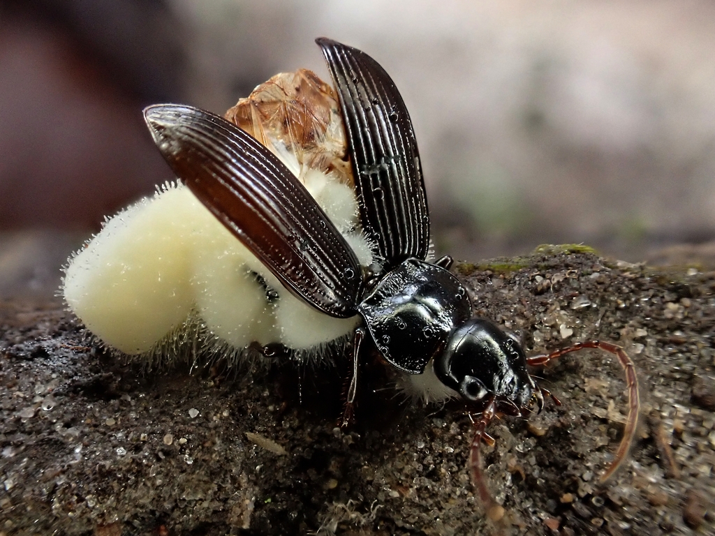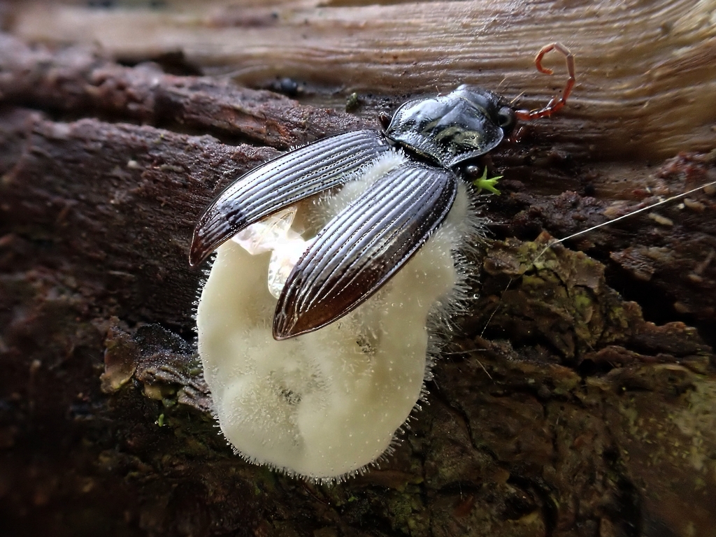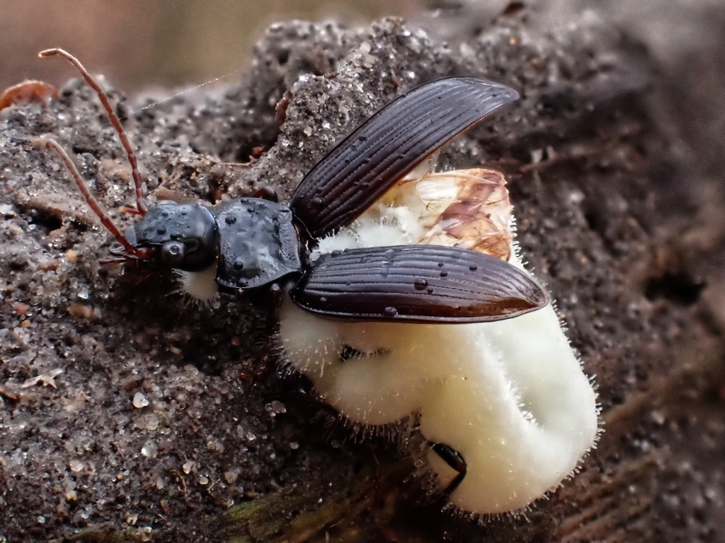 Löwitzer Holz bei Rehna (Nordwest-Mecklenburg), in feuchtem Erlenbruch, auf einem toten Laufkäfer wohl der Gattung Nebria, 2.Dezember 2025.