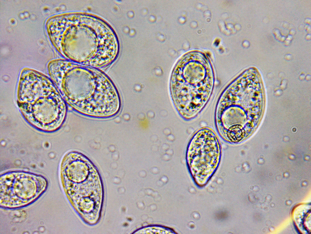 Dafür haufenweise Sporen (Konidien?) mit bis zu 2 Öltropfen, sehr unterschiedlich, Sporen 20-35 x 12-17µ. Die können scheinbar leicht platzen, auf dem letzten Foto zeige ich eine gerade geplatze Spore, aus der der Öltropfen hervorgequollen ist.