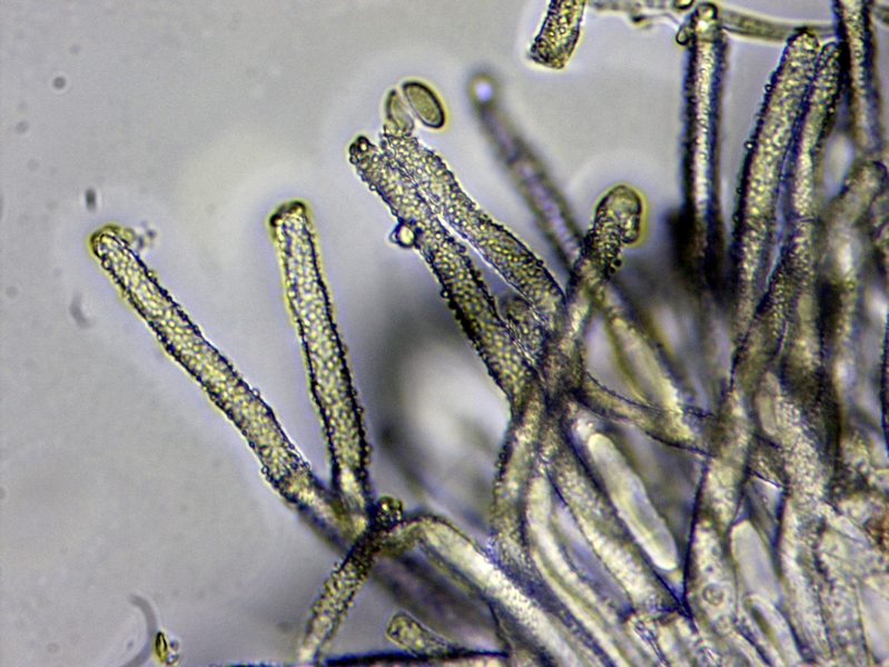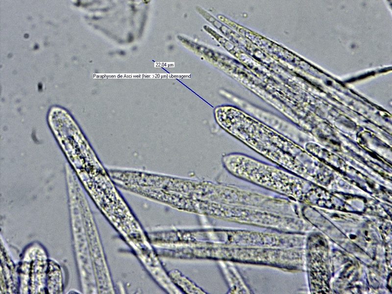 Leider keine Sporen gefunden, Asci wohl noch unreif. Auffallend die spitzen Paraphasen, die die Asci um 20-30 µm überragen. Kleine Asci unter 50 µm, andere bedeutend größer.