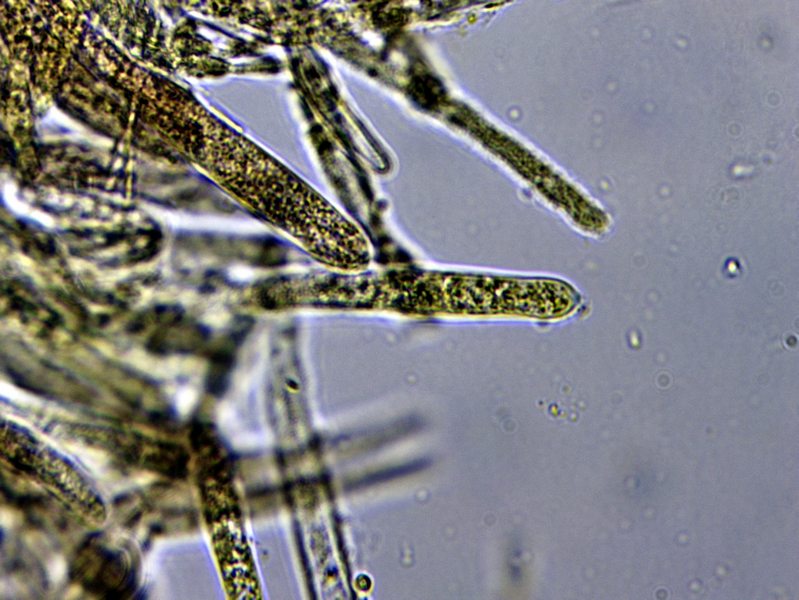 IKI = blau. Haare stark inkrustiert, septiert, zylindrisch, siehe Foto.