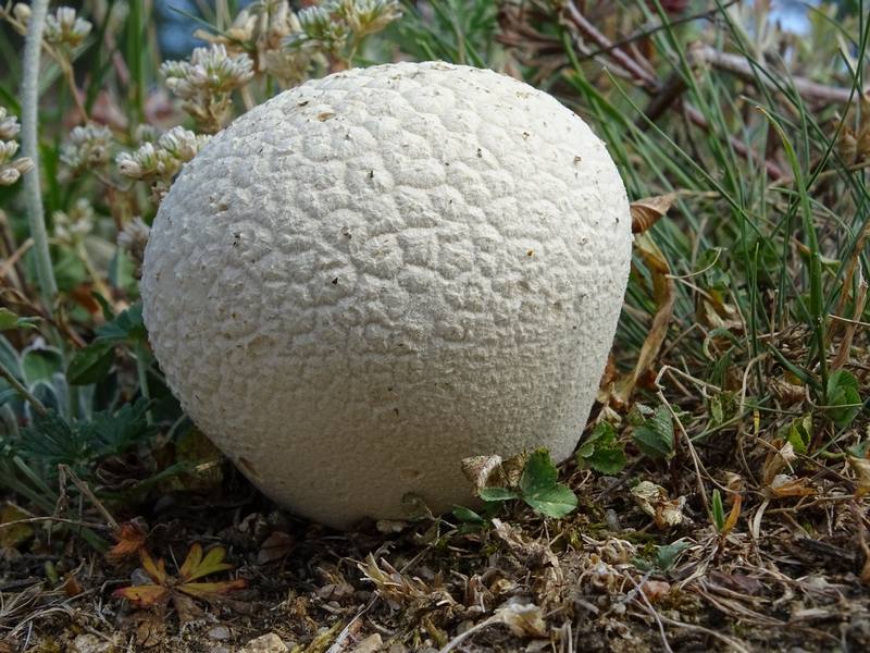 Diesen kleinen Bovisten fand ich Mitte Juli in Bulgarien, Rila-Gebirge, auf einer grasigen und blütenreichen, eher sandigen Hochfläche auf ca 1300 m Höhe einzeln wachsend. Ich konnte den Pilz leider nicht zur weiteren Untersuchung mitnehmen, er erinnerte mich an Lycoperdon pratense, ist mir allerdings zu sehr grob gefeldert. Im Durchschnitt innen weiß.