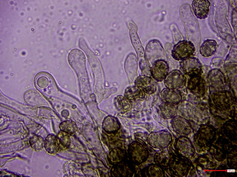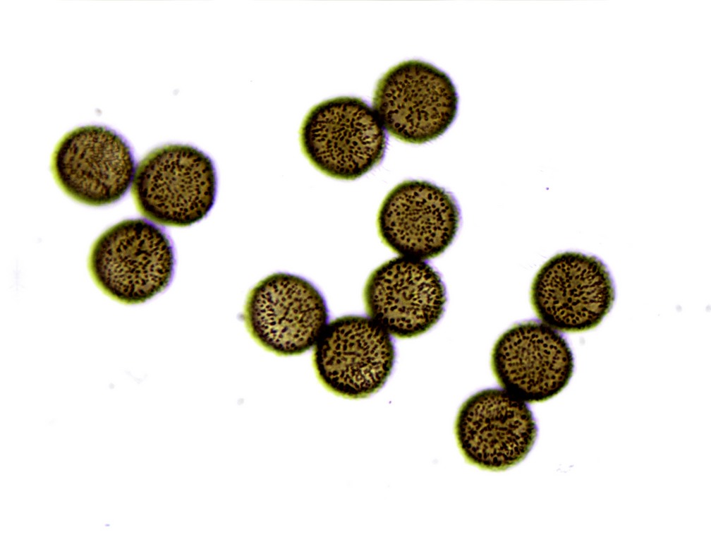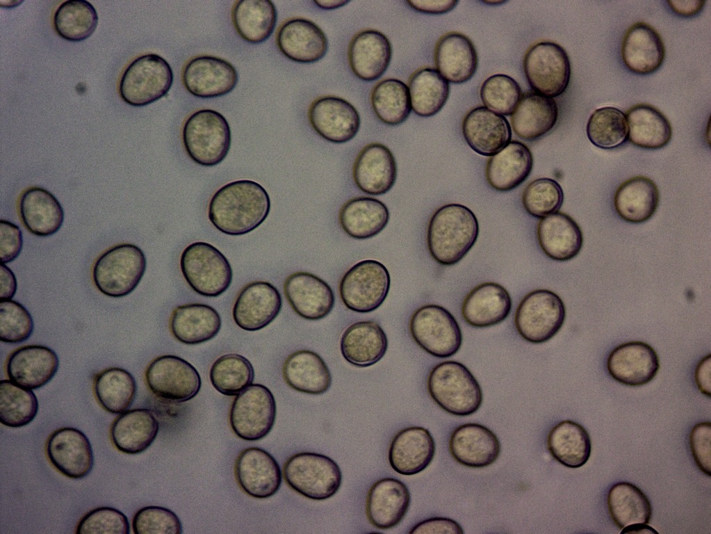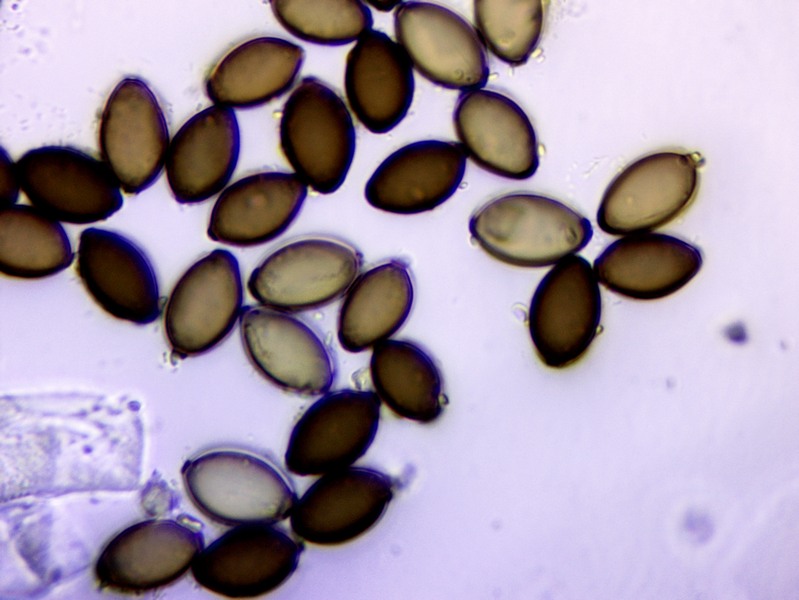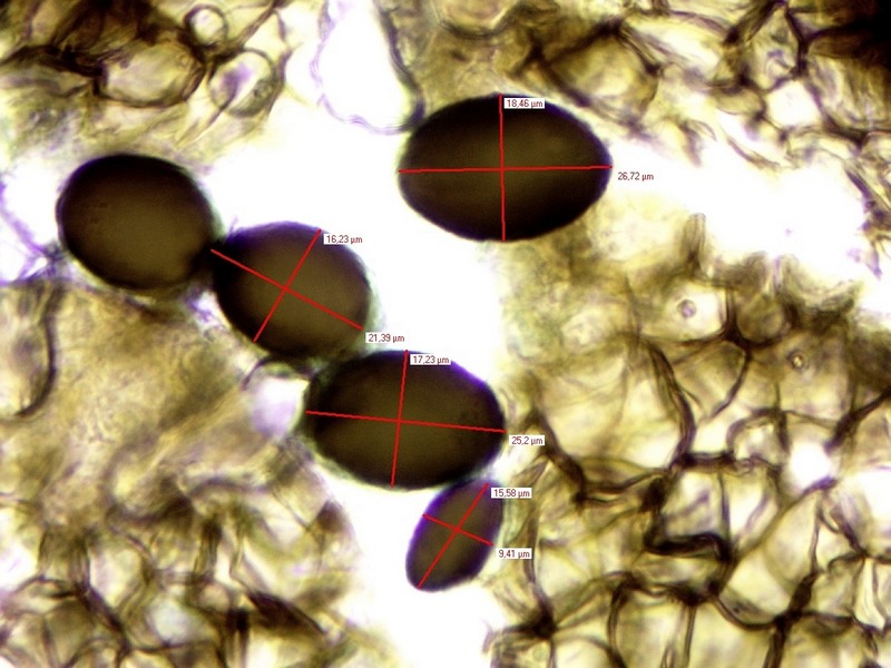 Sporen glatt, rundlich bis unregelmäßig elliptisch, 6-8 x 7-10 µm, einzelne mit angedeutetem Keimporus.