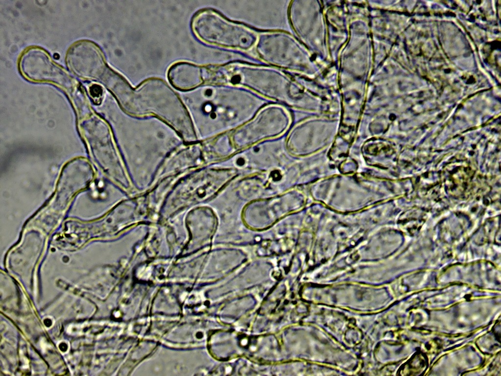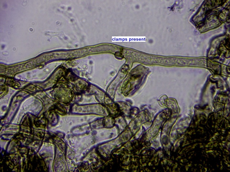 An den Septen oft mit Schnallen, etliche blasig-keulige Elemente, Basidien zylindrisch bis ausgebuchtet und 4-sporig, Sporen irregulär rundlich mit dicken Knubbeln, 9-11(-13) x 8-10 µm. Keine erkennbare Reaktion in KOH.