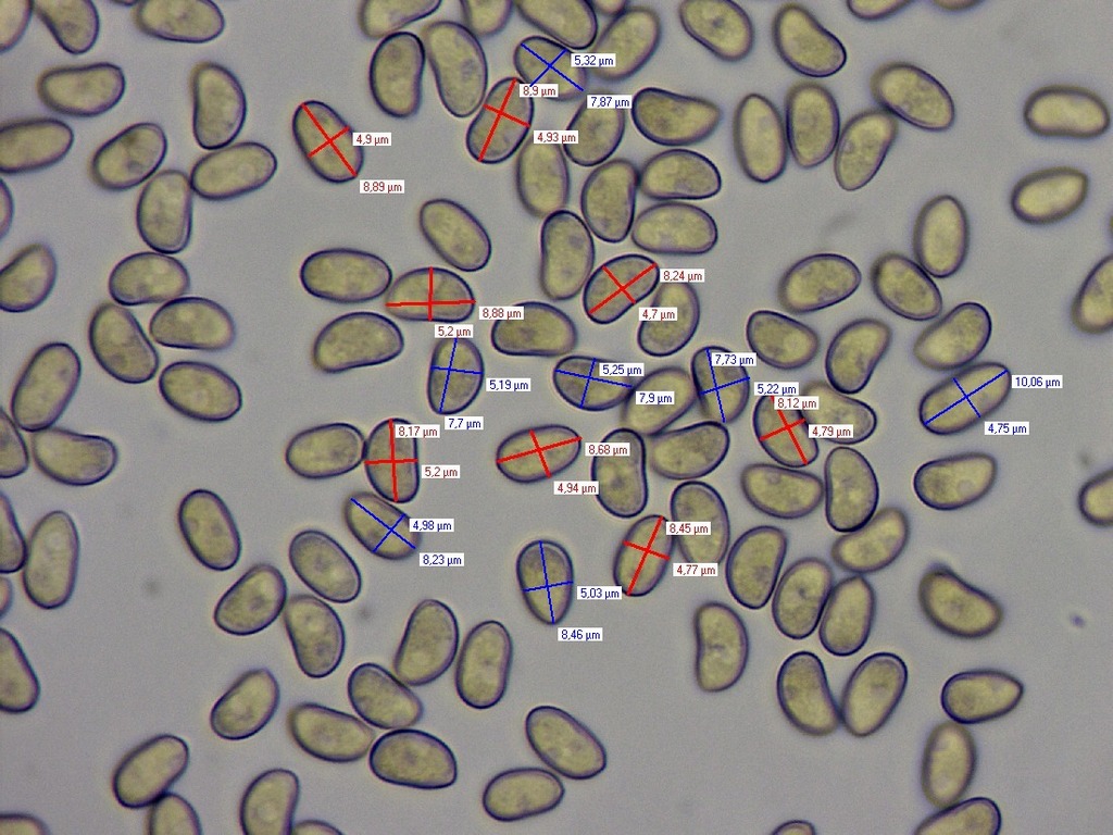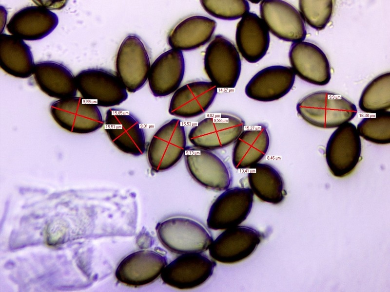 Sporen -10 manuelle Messungen: 7-8,5 x 5-5,5 (Durchschnitt: 7,8 x 5,1), 15 Messungen mit Computer-Messprogramm: 7,7-10,0 x 4,7-5,3 (Durchschnitt: 8,4 x 5,0)