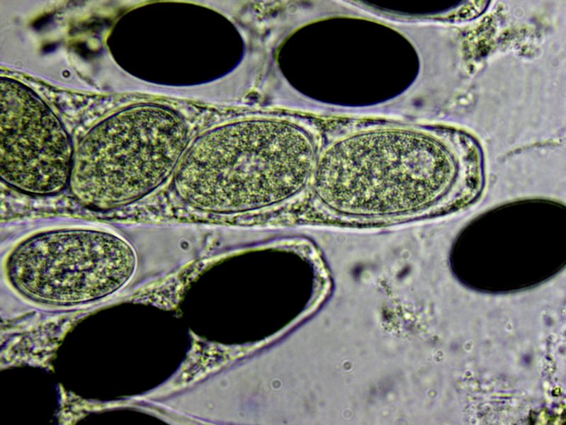 Es finden sich nicht nur die um die 60x7 µm breiten Asci mit diesem länglichen Muster, das du richtig als fädige Sporen erkannt hast. Wenn man lange genug sucht, schwimmen auch solche fadenförmigen Sporen herum, die kleinsten um 30 µm lang, die längsten um 45 µm, meist aber 32-42 µm lang und <2 µm breit.