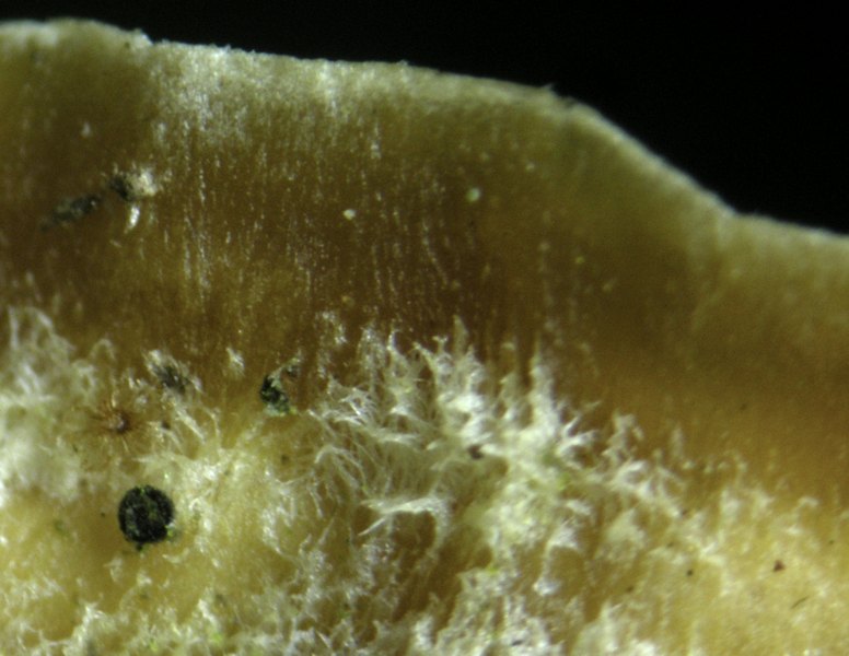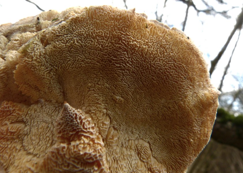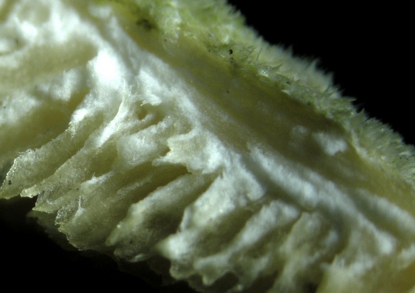 Lamellen braun, herablaufend, recht eng stehend.