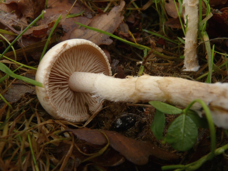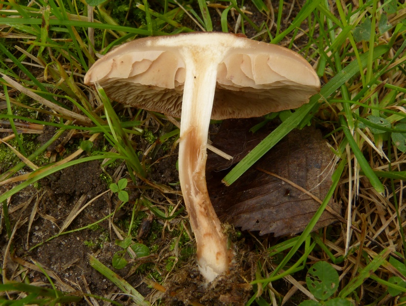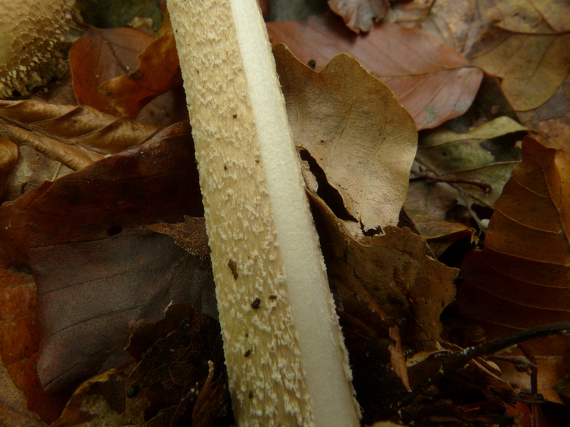 Stiel kräftig, faserig, dabei fest und voll, ohne Ring, Farbe grauweißlich bis schwach bräunlich überfasert.