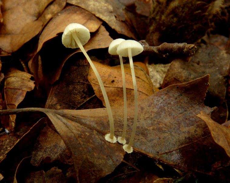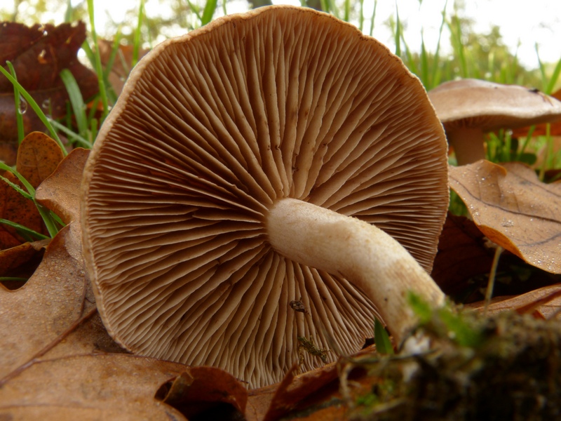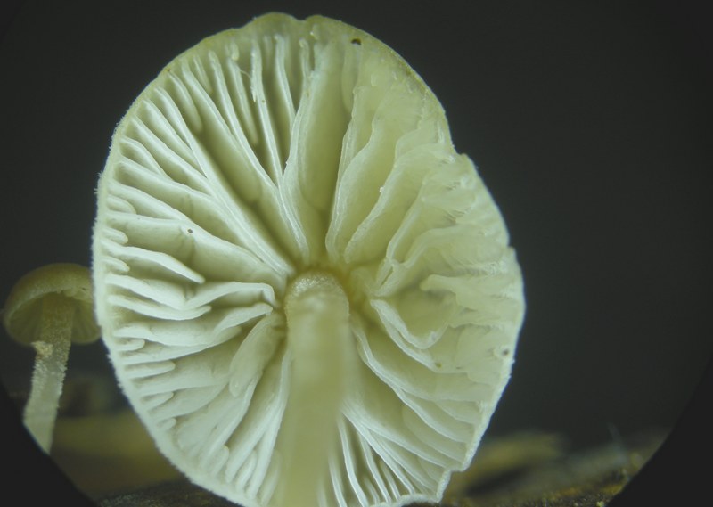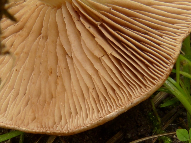 Lamellen weißlich, mäßig gedrängt, mit Zwischenlameletten, erst gerade, zum Stiel hin dann gerundet-bauchig, fast frei (oder ganz frei?).