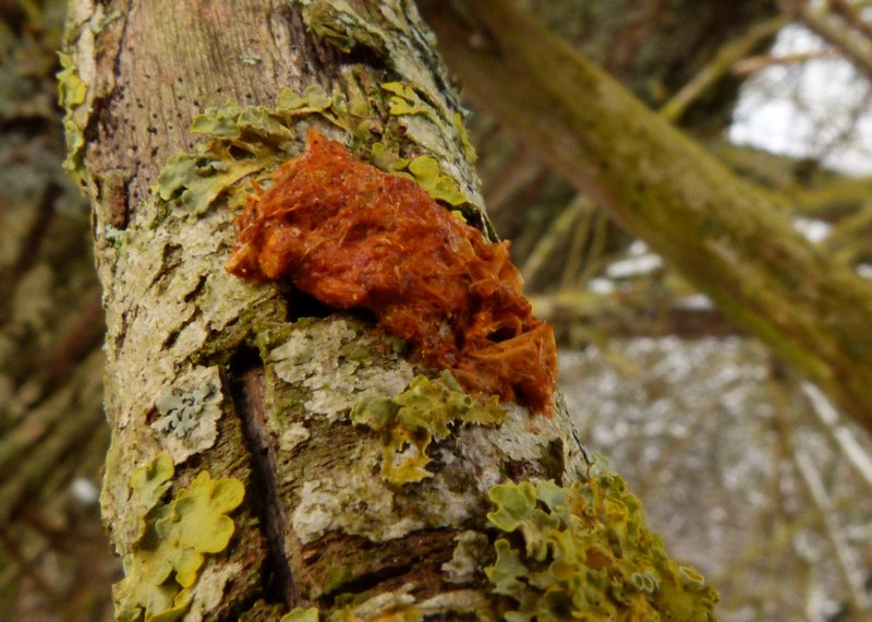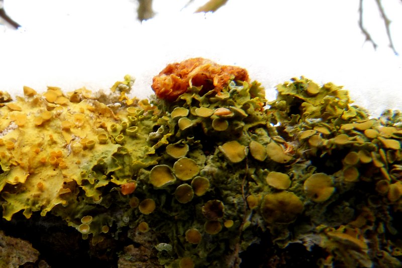 Heute fielen mir am Ostufer der Schlutuper Wiek / Grenze SH-MV an einem Baum im Gehölzstreifen am Wasser zwischen den zahlreichen gelb bis grüngelb gefärbten Gewöhnlichen Gelbflechten (Xanthoria parietina) mehrere solcher an Zitterlinge (Tremella) erinnernden Gebilde auf. Weiß jemand, was das ist?