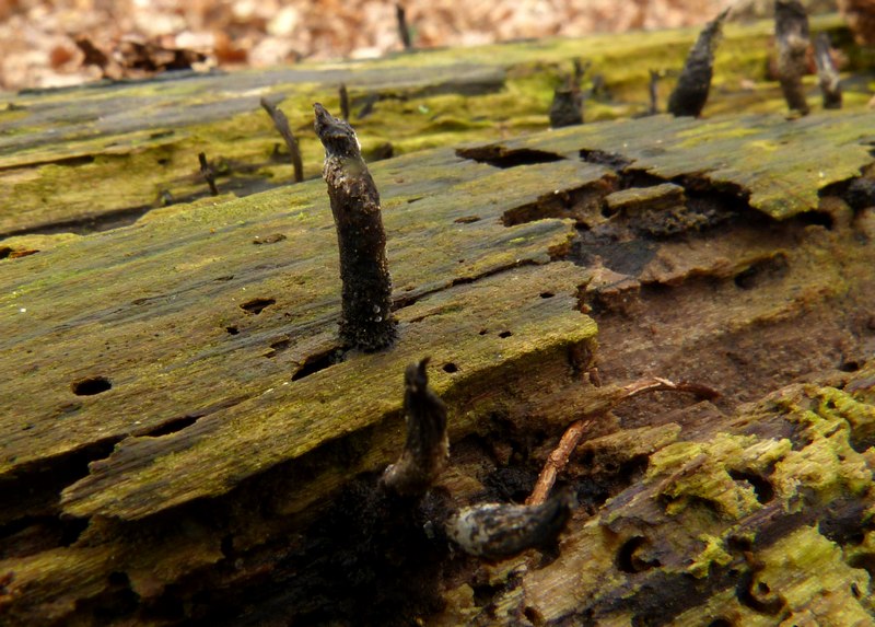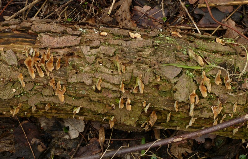 die hier hätte ich heute bei dem trüben Wetter im Laubmischwald bei Lübeck fast übersehen. Sie wuchsen auf einem halbverrotteten liegenden Laubbaumstamm. Ziemlich dünn, vielleicht 2-3 cm hoch. Ich habe nur Fotos gemacht, nichts abgebrochen o.ä.