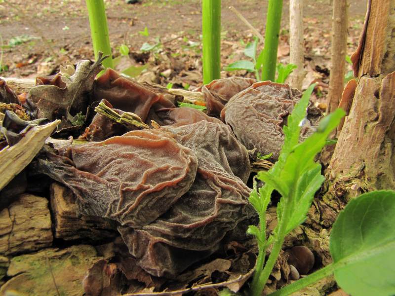 Ich war etwas unsicher, denn ich kenne Judasohren als schön braune, ohrförmige Pilze. Diese hier sehen doch ziemlich "unförmig" und recht weißfilzig aus, schienen außerdem ziemlich ineinander gewachsen - daher meine Rückfrage, ob es sich evtl auch um den gezonten Ohrlappenpilz hätte handeln können.