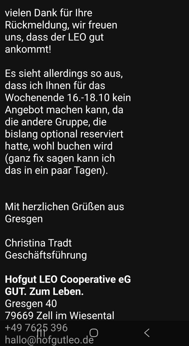 Anscheinend sieht es mit dem Hofgut Leo nicht so gut aus - in den nächsten Tagen bekomme ich Bescheid, ob eine andere Gruppe nun fest den von uns gewünschten Zeitraum reserviert hat