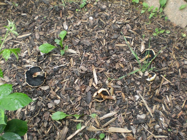 Die Pilze wachsen unter unseren Büschen. Ich nehme an das die Sporen im Rindenmulch waren, welches wir letztes Jahr dort verteilt hatten.Geruch: Beim erschnüffeln des großen Pilzes roch er etwas nach Anis. Tippe auf einen Champignon aber die kleinen haben weisse Lamellen.