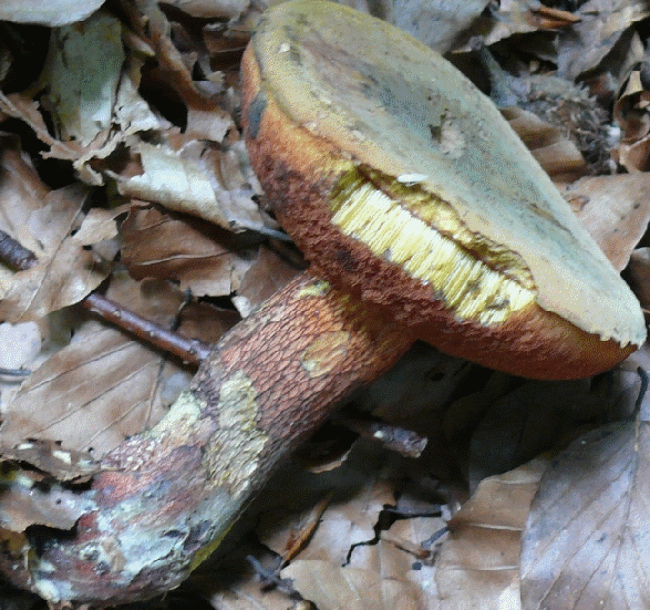 Röhrling 2a und 2b könnten Schönfußröhrlinge allerdings ist der Stiel oft ganz glatt ohne weiße Netzzeichnung. Ein älteres gefundenes Exemplar zeigt im oberen Teil des Stieles ein weißes Netz auf und sieht sonst genau gleich aus. Hutfarbe ist beige. Die rote Färbung des Stiels ist fast komplett verschwunden, was aber wegen der Sonneneinstrahlung möglich ist.