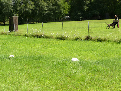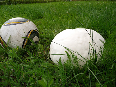 Letzte Woche war ich auf dem Hundeplatz in Neustadt, wo ich mit meiner Hündin trainiere. Auf dem kleineren Platz, den man eher für große Veranstaltungen benutzt, wo Zelte und WoWas aufgestellt werden, und Hunde kommen nicht drauf, kommen jedes Jahr Riesenbovisten. Im letzten Jahr habe ich eins mitgenommen, aber Geschmack hat mich nicht überzeugt, daher war ich nicht besonders scharf die beiden mitzunehmen, aber für Fotos waren sie einfach Klasse.